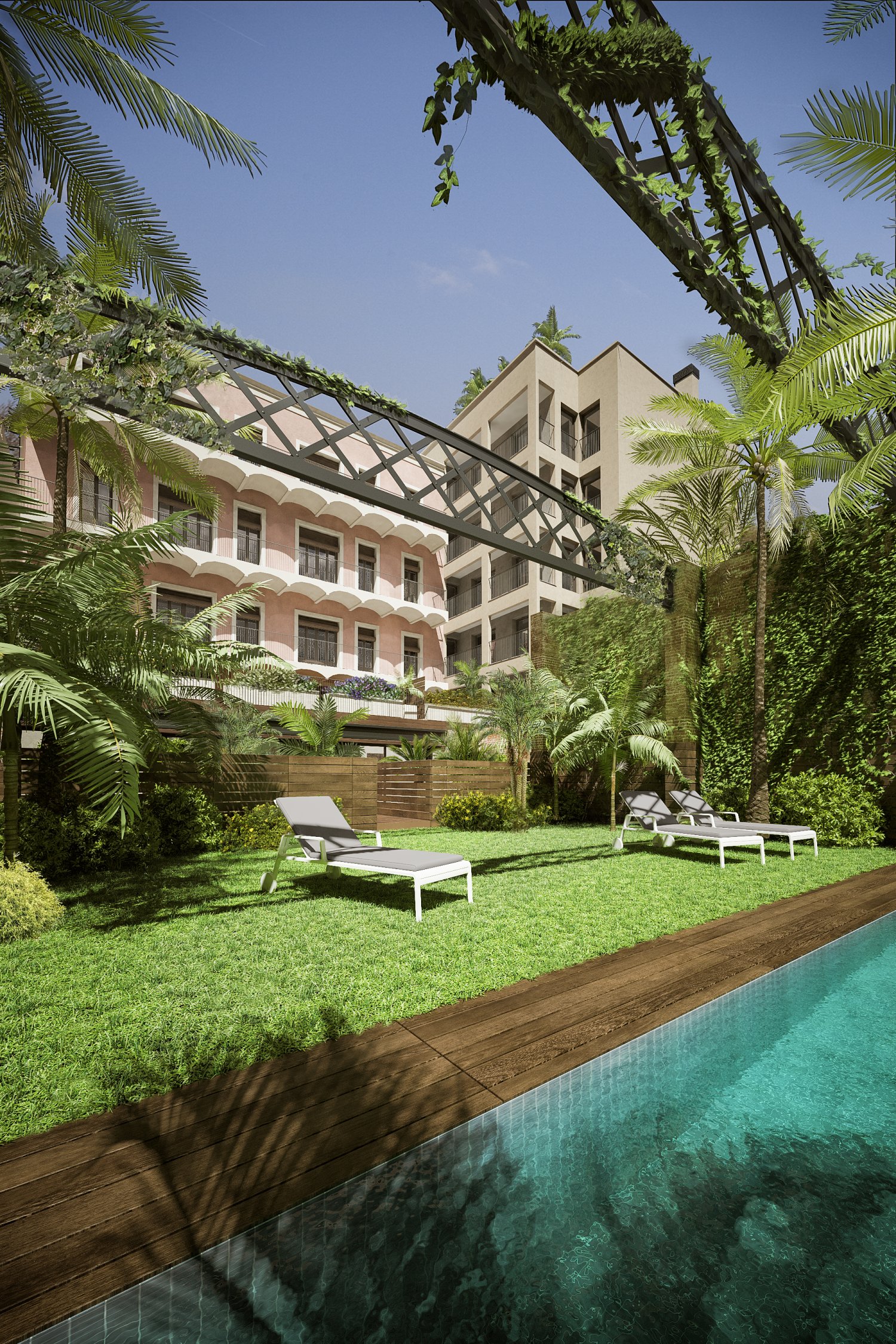 La fachada modernista delicadamente trabajada y restaurada con sus tres ejes verticales, arcos de medio punto y esgrafiados florales alberga en su interior un paradisiaco patio ajardinado de 145m2 con piscina, auténtico oasis de privacidad que nos permite ofrecer una propuesta única del sector de lujo en Barcelona. En la azotea encontramos otra zona comunitaria de 116m2 con piscina y una impresionante vista del skyline de la ciudad.