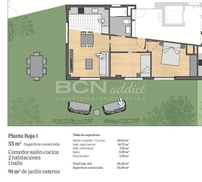 La vivienda de 55 m2 es totalmente exterior, luminosa, versátil y confortable. La cocina abierta conectada con salón crea zona amplia y luminosa que da al jardín. El baño completo viene con ducha moderna.
