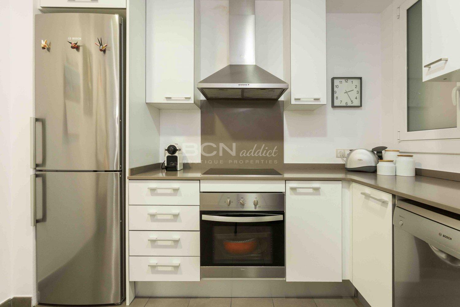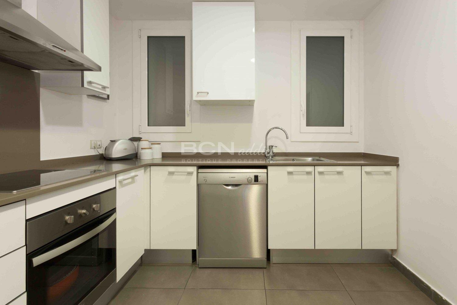 El piso ede 95 m2 stá ubicado en el primer piso de un edificio modernista con techos altos de 2,7 m de altura, con "Volta Catalana". El piso reformado presenta una redistribución entera de la superficie. Se distribuye claramente en dos áreas: día y noche. En el lado calle, la sala de estar y el dormitorio principal (con baño privado) se benefician del acceso al balcón. La cocina contemporánea tipo office ofrece muebles integrados y electrodomésticos: horno, extrator, fogones, horno, lavavajillas y nevera.