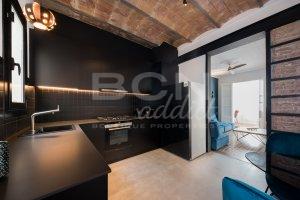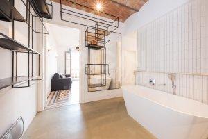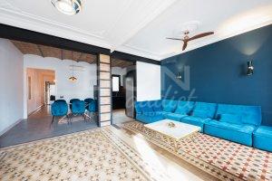 El piso está completamente renovado y mezcla elementos originales (suelo hydraulico, carpintería original, paredes de ladrillo vista y techos de ladrillo o techo con molduras) con un interior moderno y materiales de alto standing de marcas conocidas.