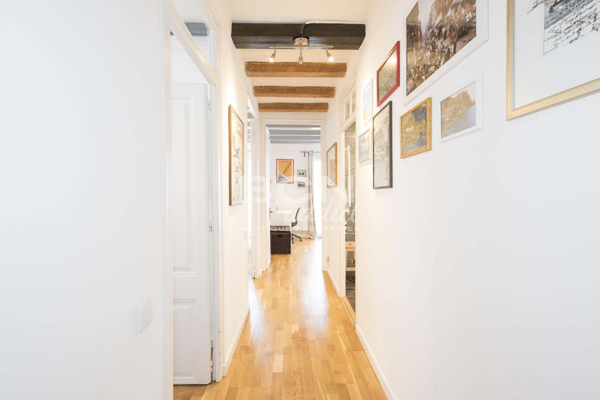 La propiedad está en excelentes condiciones ya que fue renovada hace unos años. El ático combina elementos originales (carpintería interior, paredes de ladrillo visto o techos con vigas de madera) con diseño interior y materiales contemporáneos. Todas las habitaciones gozan de luz natural. El piso, de forma rectangular, tiene 4 puertas ventanas: dos se abren a dos balcones que miran a la calle y dos dan acceso a un amplio balcón en el patio de manzana.