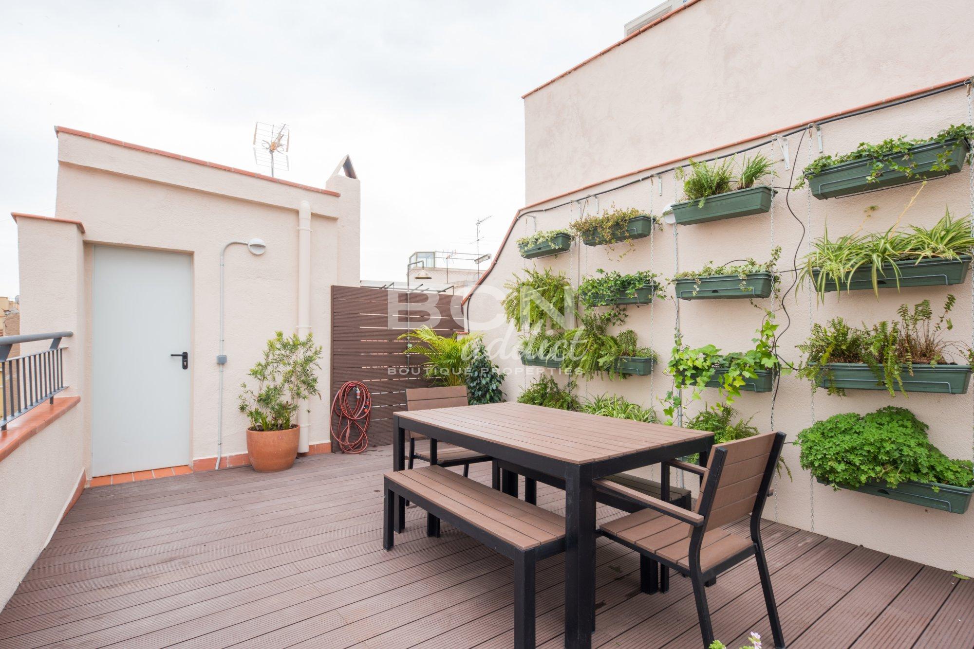 Una magnífica terraza privada de 40 m2 justo una planta encima de la propiedad, ofrece vistas panorámicas a la ciudad y las colinas del Tibidabo en segundo plano. La terraza viene con pavimento de lamas de compuesto, jardín vertical, ducha, muebles para exteriores (silla y mesa de centro), bajante, grifo de agua y acceso a la electricidad. Es un espacio apreciable para un uso multifuncional.