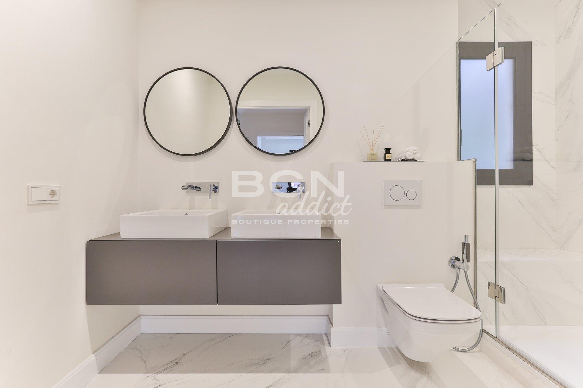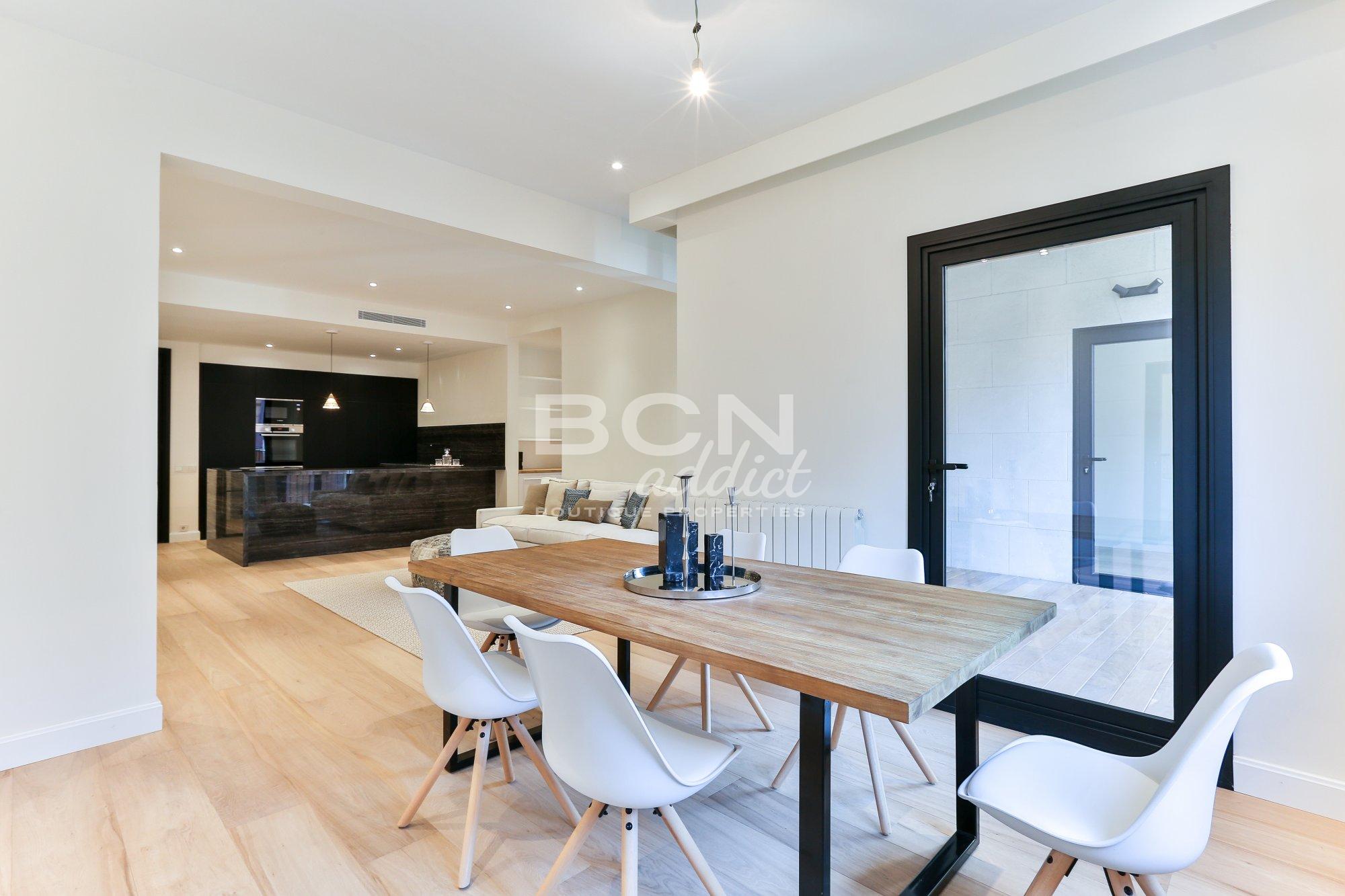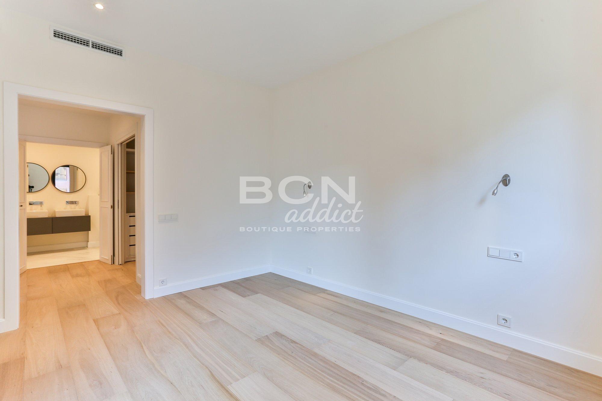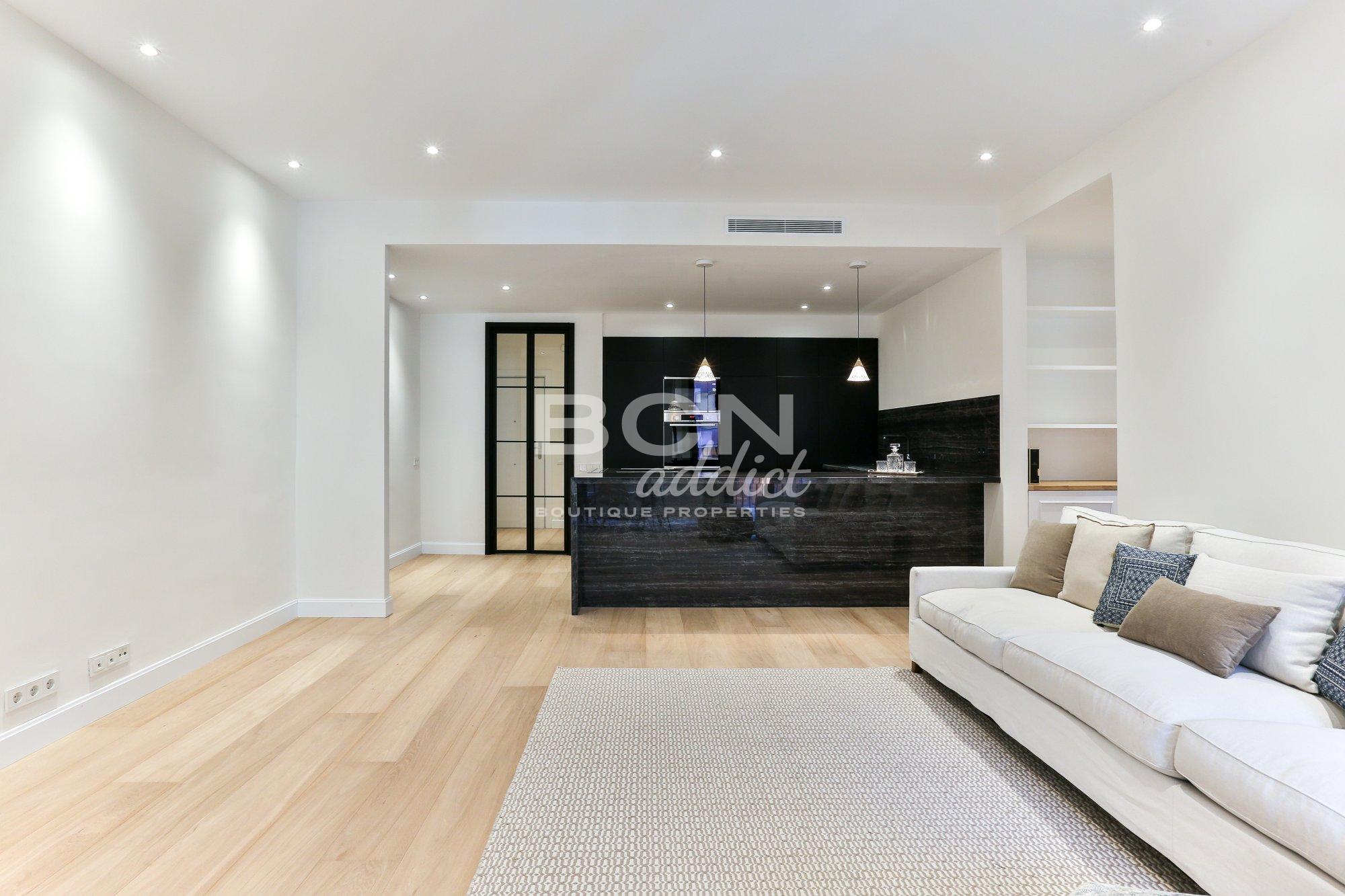 En frente del área de entrada, dividido con puerta de cristal, encuentras el corazón de la propiedad: el espacio de salón y comedor con cocina abierta, toda de Matimex, junto ocupando 50m2. Grandes ventanales y dos puertas ventanas proporcionan el apartamento con mucha luz natural, como la propiedad esta acotada alrededor de una terraza amplia que abre a la calle Muntaner. Pasando por la despensa pequeña, llegamos a la otra zona de noche: una suite grande y espaciosa. La primera área que pertenece a la suite es un espacio multifuncional que puede ser adaptada según tus planos, por ejemplo como despacho o biblioteca. Una puerta doble a la izquierda lleva a baño grande, equipado y decorado con materiales y detalles de primera calidad. La suite de 26m2 tiene también vestidor. Totalmente dividido del resto de la propiedad, esta suite espaciosa da sensación de intimidad, mientras que puerta ventana lleva a la terraza que la proporciona con mucha luz natural de la mañana.