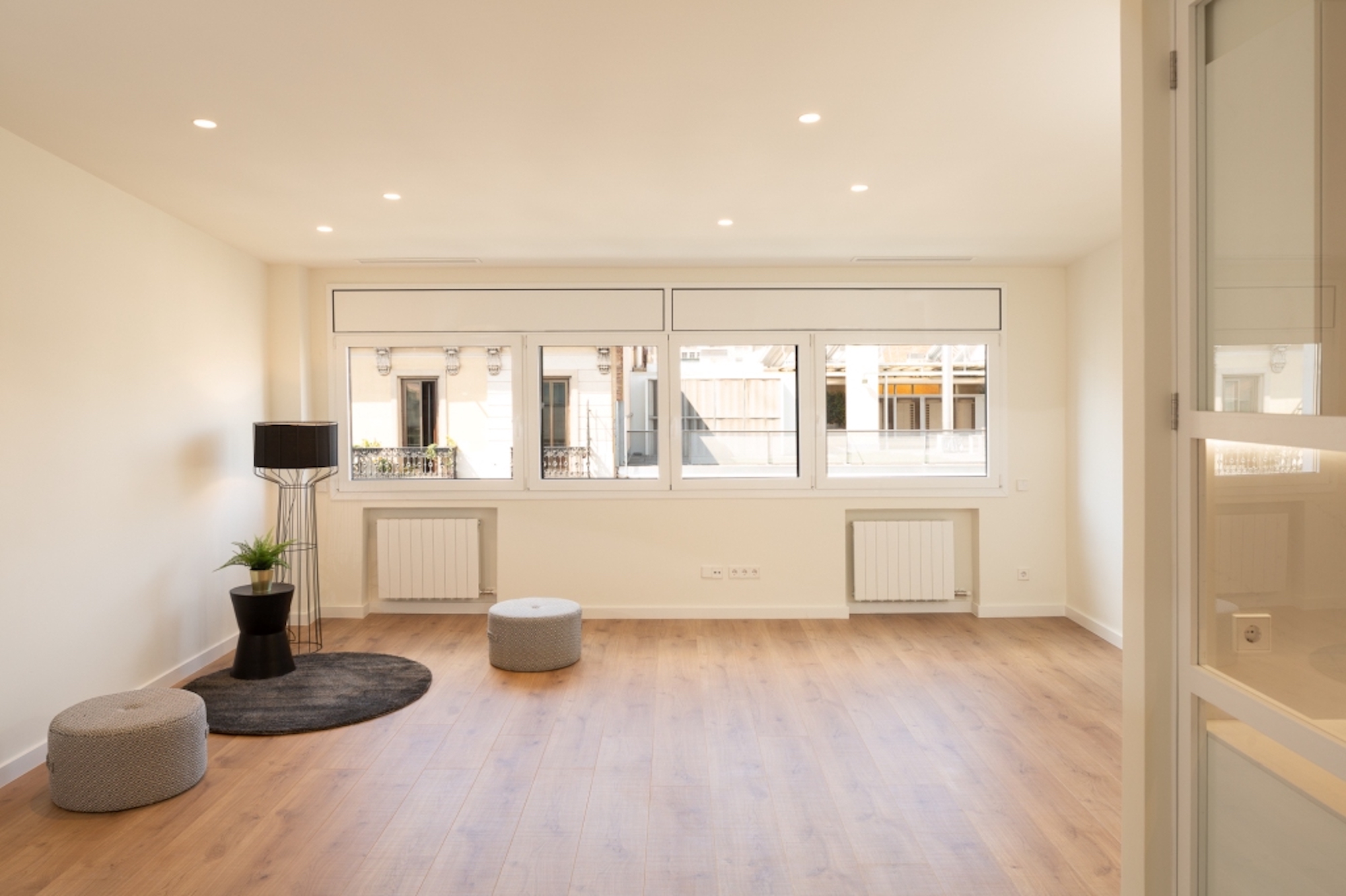 Situado en la 6ª planta de altura real, el apartamento es increíblemente soleado y luminoso en todas sus estancias. Abriendo a la calle Tarragona y siendo totalmente exterior, recibe sol durante todo el día y presume de vistas al centro de la ciudad. Minuciosamente renovado en estilo moderno, la propiedad es espaciosa y luminosa, el efecto aumentado gracias a la elección de colores claros usados en los interiores. Los 96 m2 de superficie están distribuidos de manera práctica. El recibidor amplio nos lleva al corazón del apartamento: salón-comedor de 25 m2. Sus grandes ventanales ocupan toda la fachada exterior, gracias a que recibe sol. Independiente del salón, la cocina está orientada al espacio de comedor. Totalmente equipada, presume de máquinas de alto estanding, como por ejemplo Bosch, Siemens o Grohe. Justo detrás de este espacio se esconden habitaciones: la suite principal con baño y dormitorio individual, mientras cuando el otro dormitorio doble y segundo baño completo con zona de aguas son accesibles desde el recibidor. Minuciosamente elegidos detalles, como por ejemplo suelos de gres porcelánico, iluminación LED empotrada o armarios empotrados, tanto como uso fabuloso de vidrio, testifican la singularidad de esta propiedad.