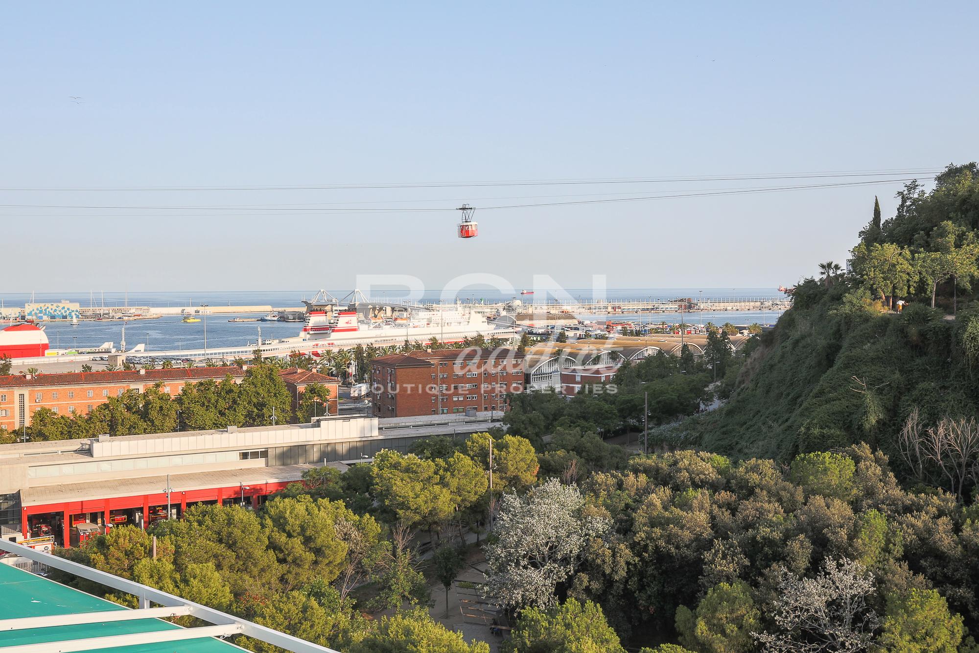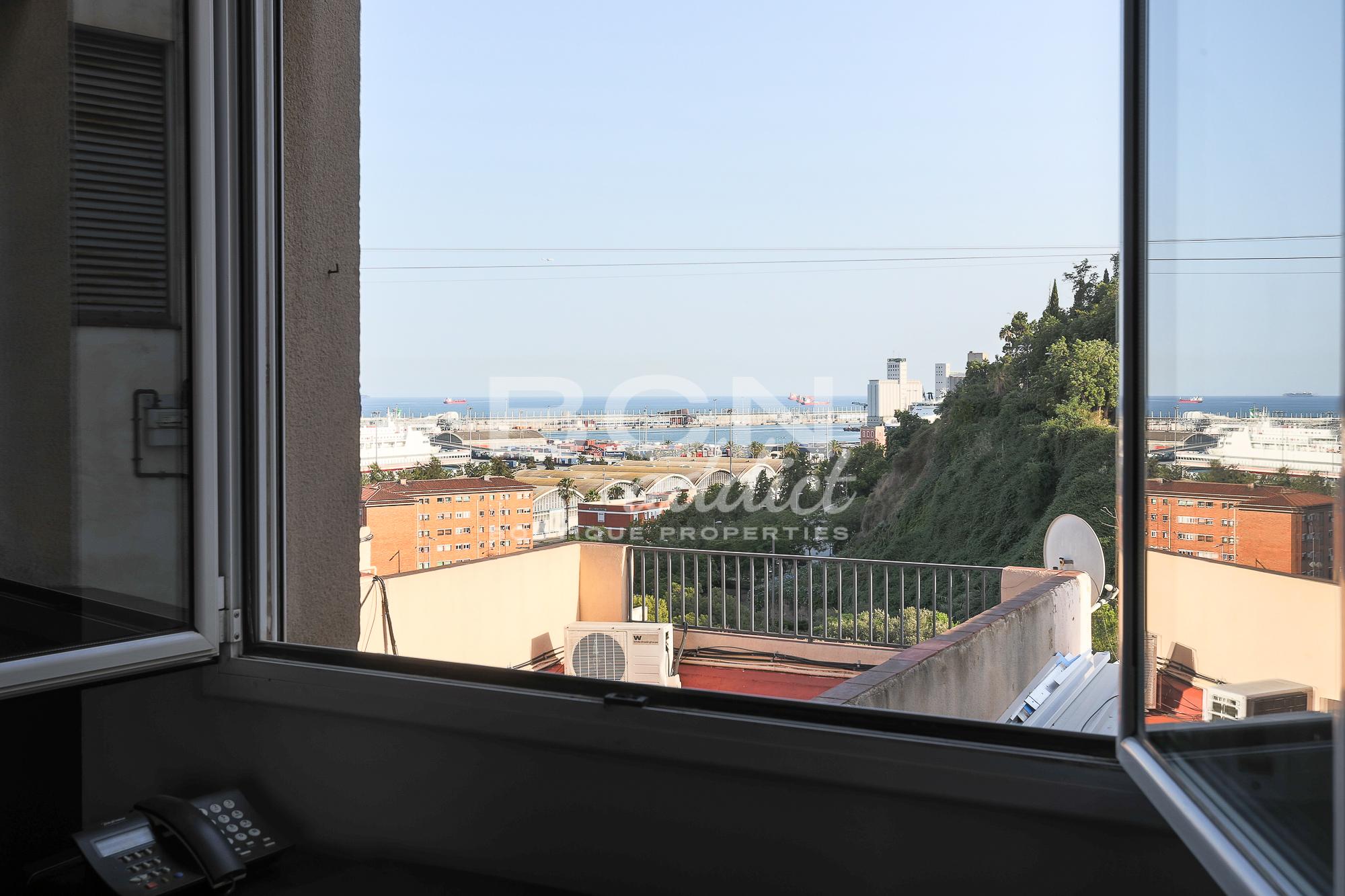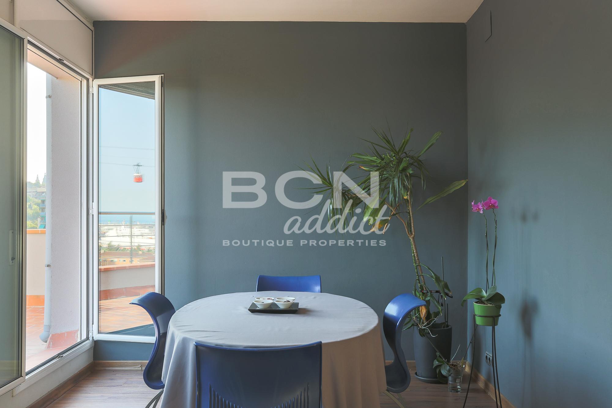 El edificio de 1968 está muy bien situado, justo en frente del parque así que tiene una vista despejada, sin vis a vis, a 360 grados. El ático tiene 94 m2 interiores construidos más 45m2 de terraza. Está en buenas condiciones ya que ha sido renovada hace 10 años. La cocina, la sala y el comedor se combinan en un espacio grande que ofrece acceso directo, gracias a 5 ventanas amplias, a una generosa terraza de 25 m2 al mismo nivel. La zona exterior orientada al sureste parece ser una extensión natural de la vivienda y ofrece vistas panorámicas al puerto autónomo y a los espacios verdes de la colina de Montjuïc. Tienes mucha privacidad siendo la última y decima planta.