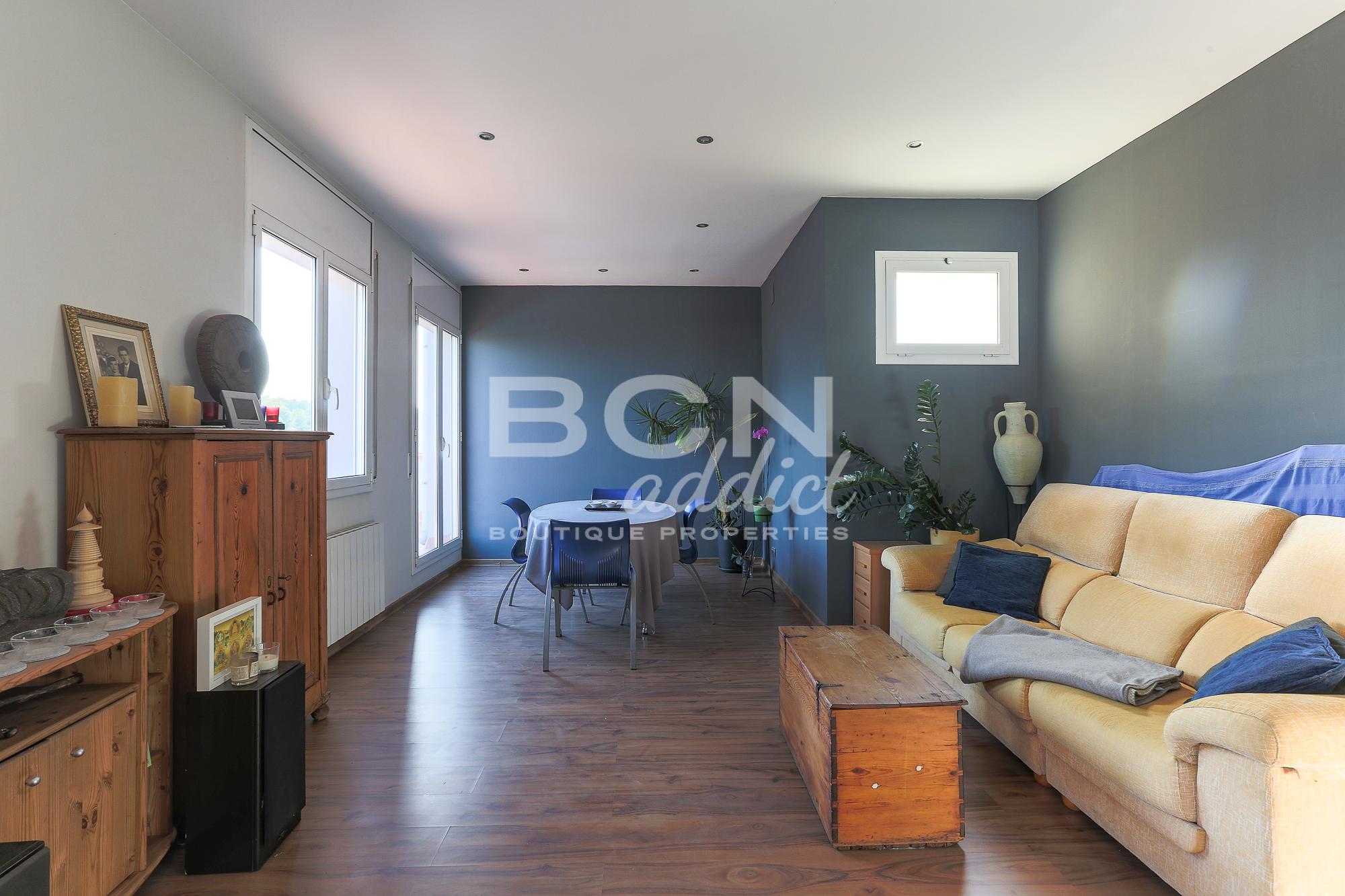 Cuando dejamos el espacio de día y pasamos al espacio de noche nos encontramos 2 habitaciones que dan a otra terraza de 20 metros. El dormitorio principal es muy grande y tiene su vestidor privado con 4 ventanas y vistas distintas cuyas 3 ventanas son puertas ventanas con acceso a la terraza. El segundo dormitorio es individual y tiene también acceso directo a la misma terraza con vistas al Tibidabo pasando por la sagrada familia y acabando con el puerto. El piso tiene aire acondicionado en la suite, ventanas de doble acristalamiento y radiadores de gas.