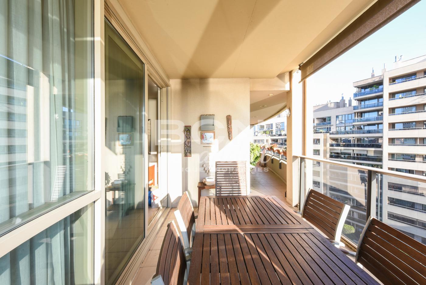 El piso de 136 m2 (superficie interior construida) cuenta con mucha luz natural y un diseño moderno en todas las estancias. El piso de forma rectangular ofrece varias aberturas grandes que dan a una generosa terraza de 25 m2. Las tres habitaciones y el salón comedor cuentan con puertas ventanas con acceso directo a la terraza con orientación sureste. La cocina separada está en el costado del edificio con vistas exteriores directas y los 2 baños están en la parte interior de la propiedad. Desde el área de recepción redonda, se accede a un luminoso salón comedor esquinero, una cocina totalmente equipada, 2 habitaciones dobles (una con armario a medida), un primero baño completo con bañera y una generosa habitación principal con un armario empotrado y con un baño privado (con bañera y bidet).