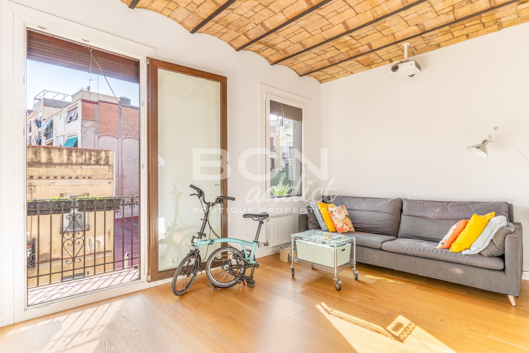 Buscar Pueblo Seco, enclavado entre la montaña de Montjuic, el puerto y junto a la zona más antigua de Barcelona, encontrarás este precioso piso reformado de 71 m2, lleno de sol y abierto por balcones en cada punta de este mismo.