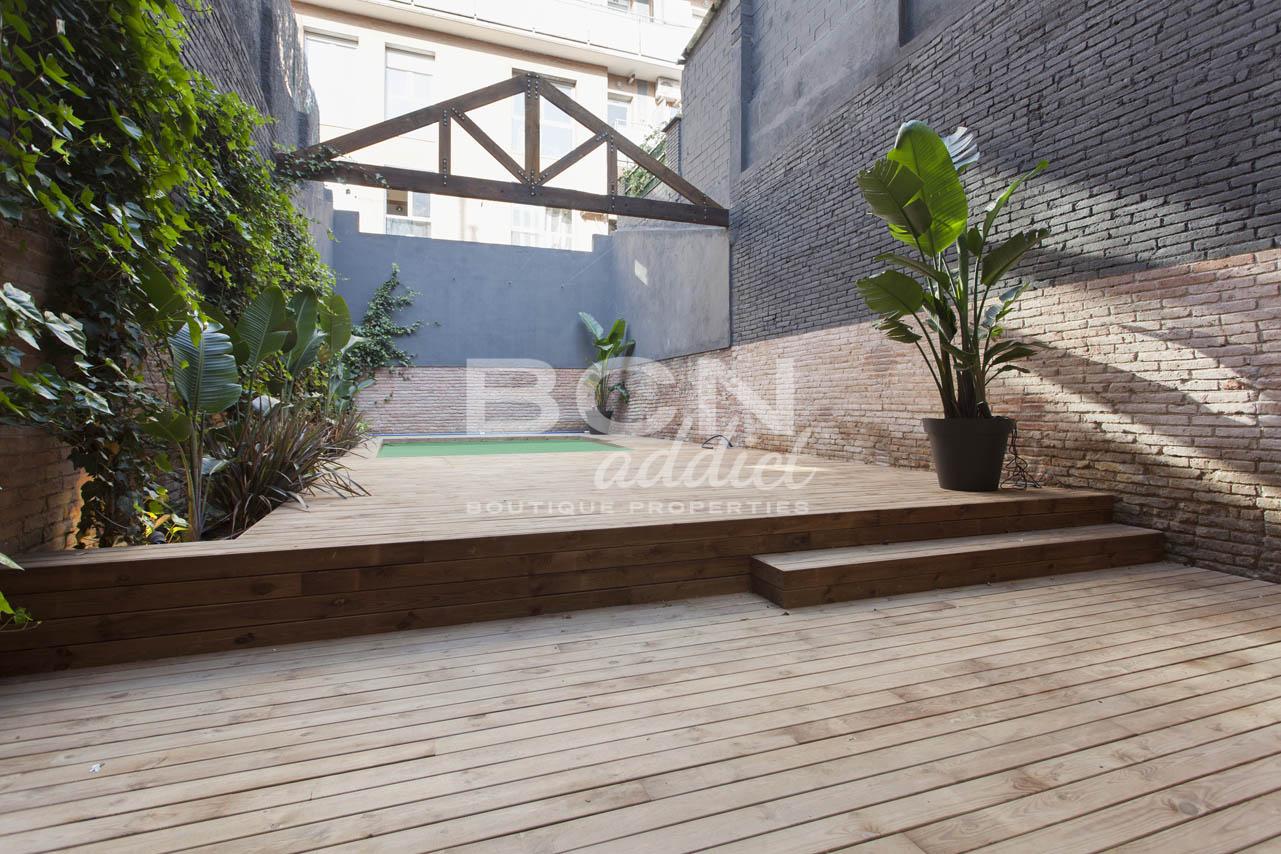 Planta baja dúplex: singular vivienda de 109m2 con terraza-jardín de 76m2 y piscina privada. Cuando estés en la cocina, completamente equipada, o sentado en el sofá del salón, podrás disfrutar de las preciosas vistas del jardín y la piscina particular.