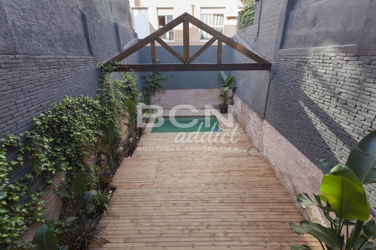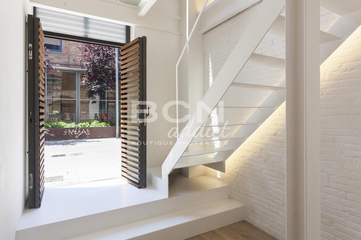 En una tranquila calle peatonal del barrio de Provençals del Poblenou, frente a la antigua fábrica de ladrillo donde hoy se ubica la universidad, se encuentra este precioso edificio con fachada de ladrillo visto, madera y vidrio que nos recuerda el pasado industrial del barrio.