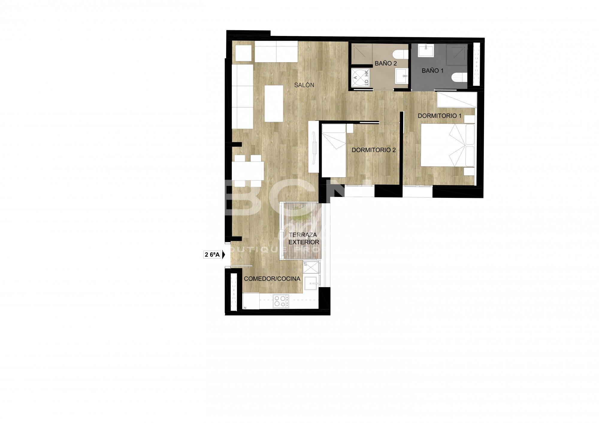 Original apartamento totalmente exterior y completamente equipado ubicado en la 2ª planta con 2 habitaciones y 2 baños completos. Terraza con vistas a la zona comunitaria. Zona de 20m2 de altillo para otra habitación o zona de trabajo. Techos antiguos con ´volta catalana´ de 3m.