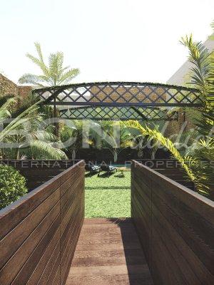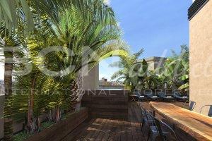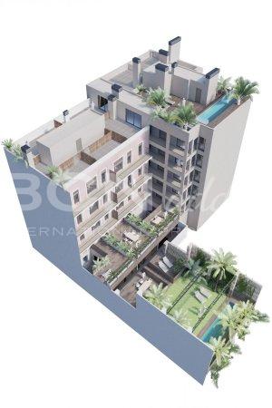 The modernist building disposes of a communal roof-top terrace with a pool and a communal garden with another pool.