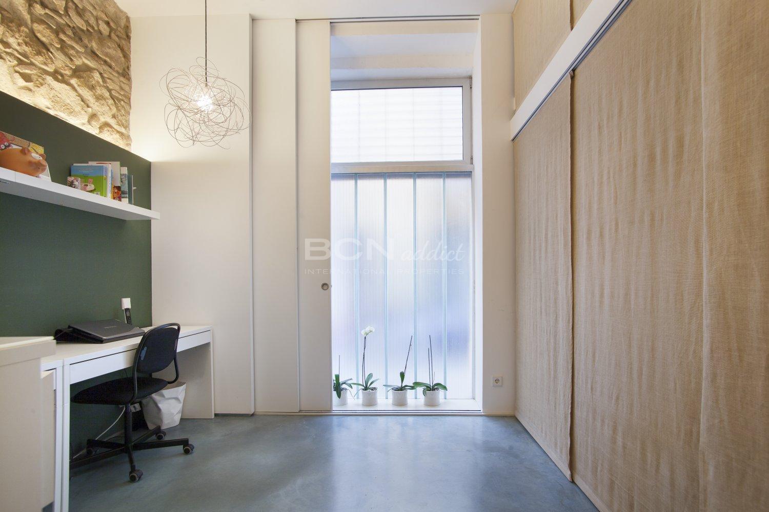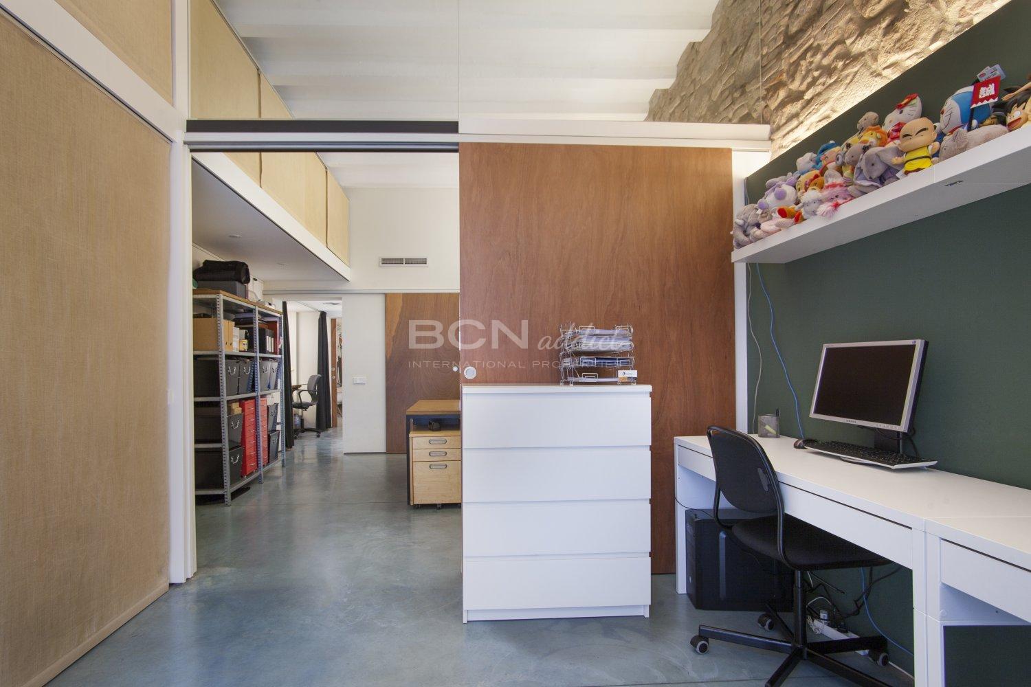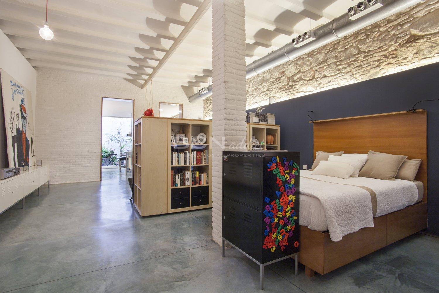 The loft consists of three spaces: Large entrance - studio with access to one bedroom, bathroom and patio. Another space with a bedroom and a living room, and a final space with kitchen linked to the patio interior.