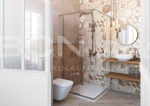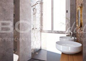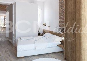 The night area is located in the back part, facing to the inner courtyard. The apartment has a master bedroom with bathroom and dressing area and a second bedroom. There is a second bathroom on the living area. The partitions are designed with a glass on the top of them trying to get the light to reach all spaces.