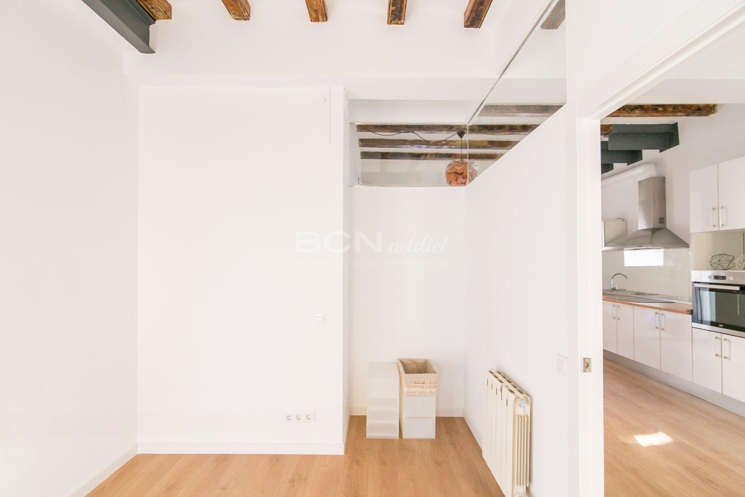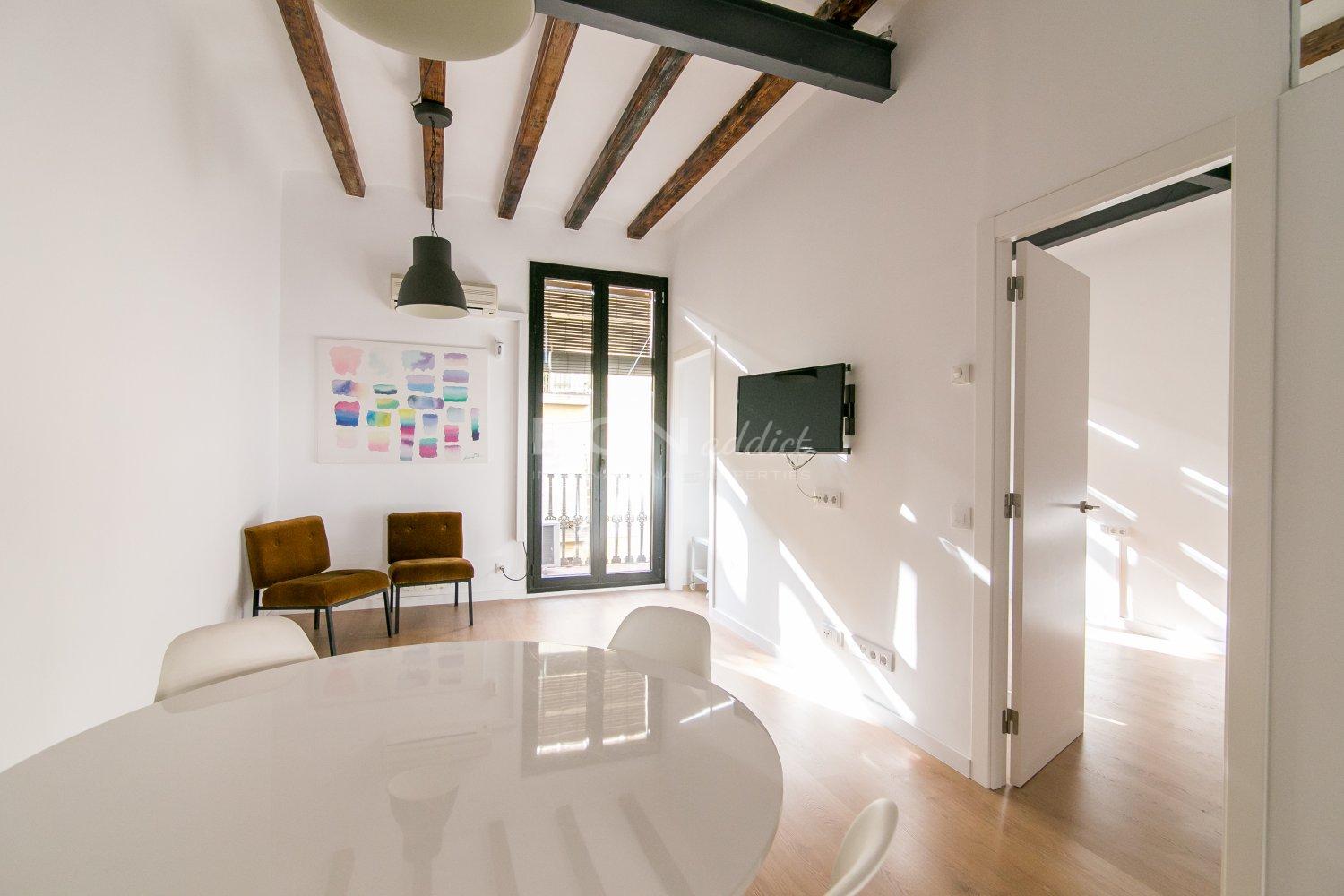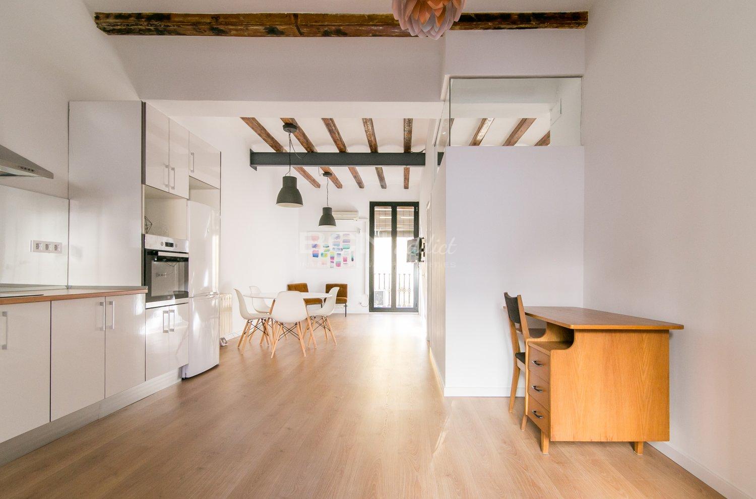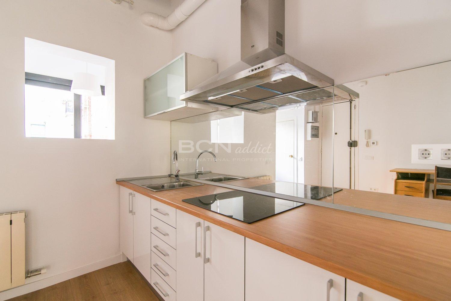 The apartment is located on Salva Street in the Barrio de Poble Sec a few meters from Parallel Avenue, perfectly connected to the rest of the city by subway and bus. It offers a dressing room, living room with open and equipped kitchen, bathroom with shower and laundry room in 55 square meters. It is equipped with heating and air conditioning for your comfort in addition to having double glazed windows.