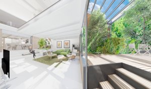 The loft is divided in two heights, seizing the light for each room, the ground floor consists of an entrance with a large hall followed by a space occupied by an interior garden that brings an important touch of exclusivity and distinction. The kitchen is open concept and merges with a really spacious dining room, there is also a living room, a bathroom and a wonderful terrace.