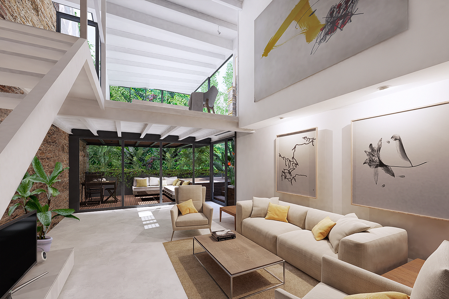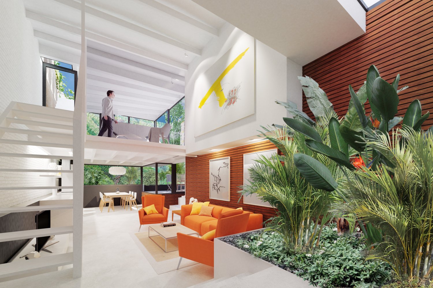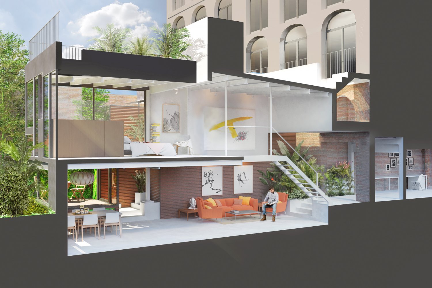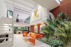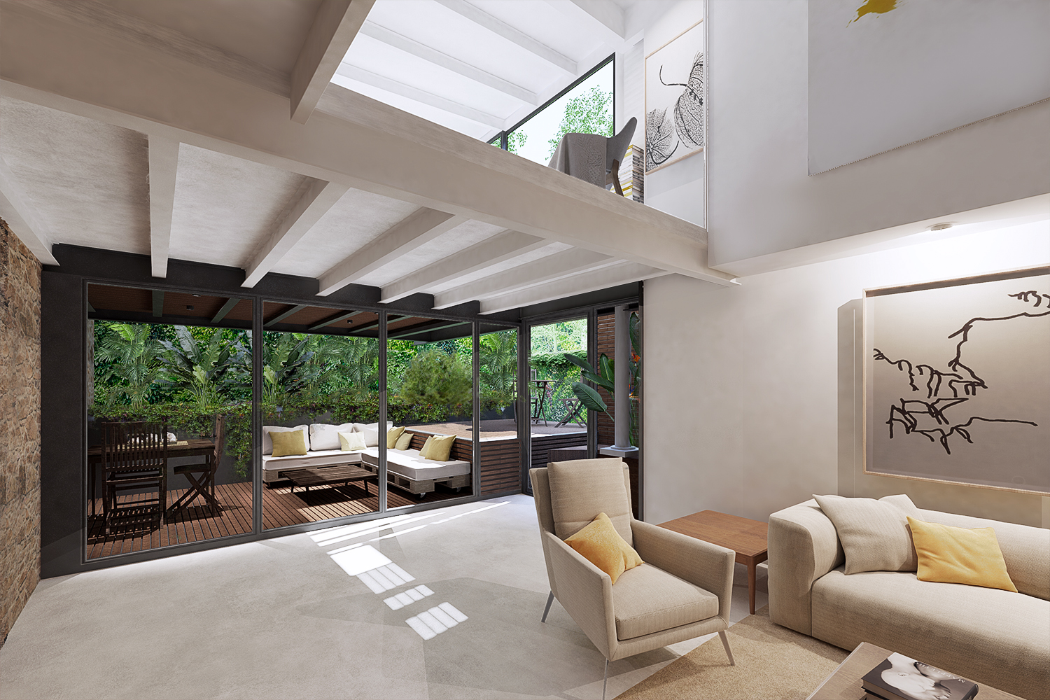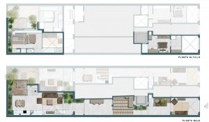 The loft is divided in two heights, seizing the light for each room, the ground floor consists of an entrance with a large hall followed by a space occupied by an interior garden that brings an important touch of exclusivity and distinction. The kitchen is open concept and merges with a really spacious dining room, there is also a living room, a bathroom and a wonderful terrace.