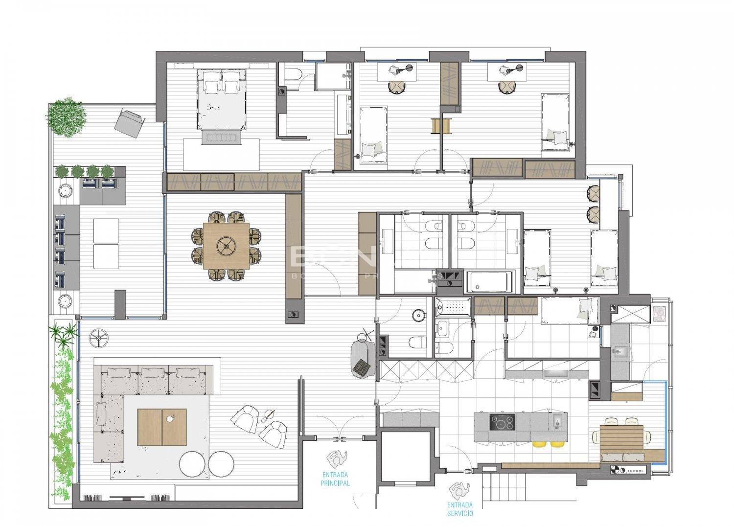It consists of a very large master suite, with dressing room, full bathroom and direct access to the terrace; there are three other very sunny double rooms with easy access to a double bathroom and another junior room with its own bathroom.