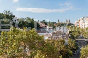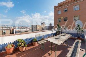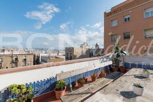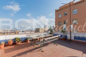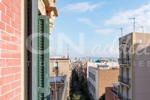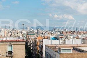 The flat features two South-East facing window-doors opening onto a large balcony (6 m2) with incredible views over Montjuic hill and gardens and a generous roof terrace of exclusive usage (35 m2) with panoramic views over the city of Barcelona.