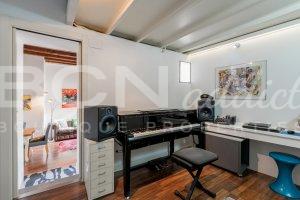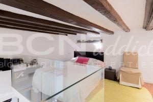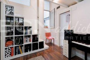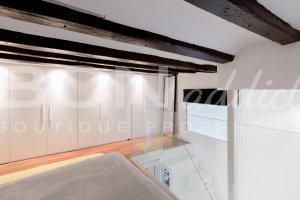 The spacious bedroom benefits from a door to an interior patio and high ceiling with a mezzanine (9 m2 additional): on the ground floor is a stylish bathroom with ample shower, a study area and several storages. The first floor provides a large built-in wardrobe and space for a king-size double bedroom.