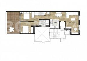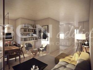 This dual aspect duplex penthouse of 100 m2 is arranged over two floors (fifth and sixth floors) with high-specification fixtures and fittings. The ground floor boasts an exceptional open-plan entertaining space divided into 3 areas: contemporary kitchen, dining room and a beautiful living room overlooking the street side.