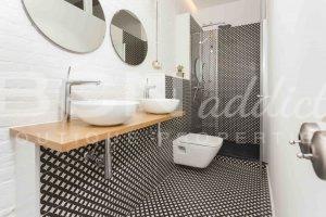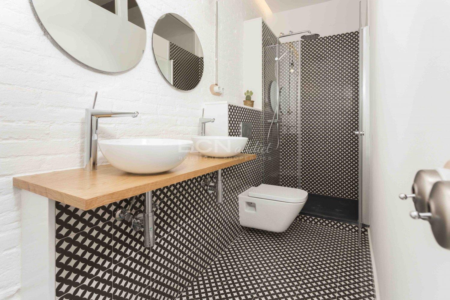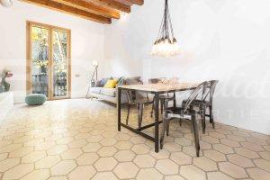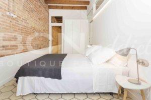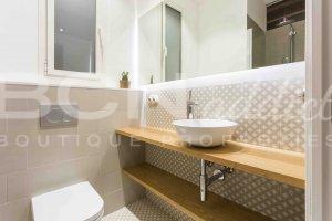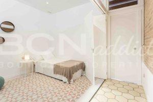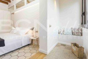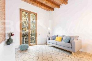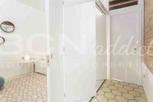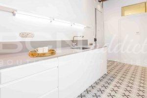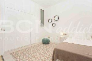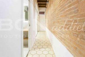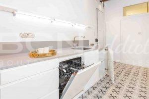 Thanks to the layout of the apartment, the interior is clearly divided into two separate areas: it has a ‘daytime’ area, consisting of an open plan kitchen, dining and living room, complete with a balcony, and a ‘night-time’ area, which consists of a bathroom, a bedroom and a master bedroom with ensuite, and this nighttime area looks out into the tranquil interior courtyard, typical of the buildings in Eixample. Many of the apartments original mosaic floors have been well preserved, giving the flat plenty of character. The ceilings have also been well preserved with their authentic wooden beams on show.