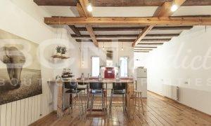 This stylish flat boasts high ceiling with exposed wooden beams and offers an open-plan kitchen (with contemporary built-in furniture and modern appliances) living dining room on the street side opening onto a vast West-facing balcony.