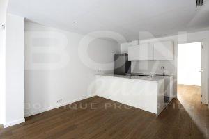 From the entrance, a reception area provides access to a double bedroom with balcony, ensuite bathroom and tailor-made wardrobe. A second complete bathroom with shower is next to the hall. The bright open-plan living dining room benefits from 1 balcony on the street side and offers morning sun with South-East orientation. The open plan kitchen has a central island with stools and boasts contemporary built-in furniture. The flat offers another double bedroom with wardrobe and balcony, accessible from the living room.