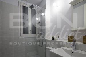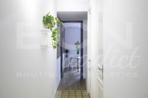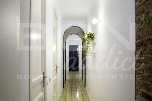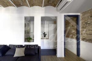 The apartment is located on the third floor of an 8-storey classic building. This 90 m2 dual-aspect flat presents bright living space and many openings throughout (West-facing window door on the street side, an interior patio and a spacious East-facing gallery overlooking a quiet interior courtyard). The apartment combines beautiful original modernist elements (such as hydraulic tiles, vaulted brick roof, exposed brick walls, wooden door and door frame) with new quality materials and installations by well-known brands.
