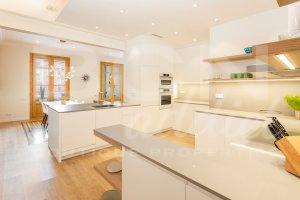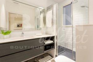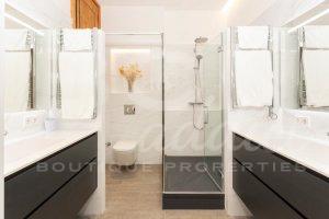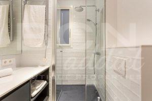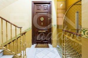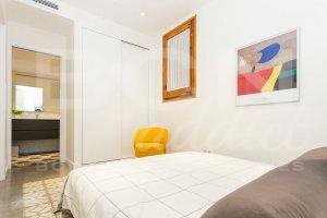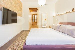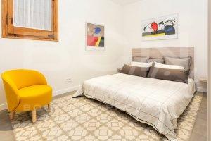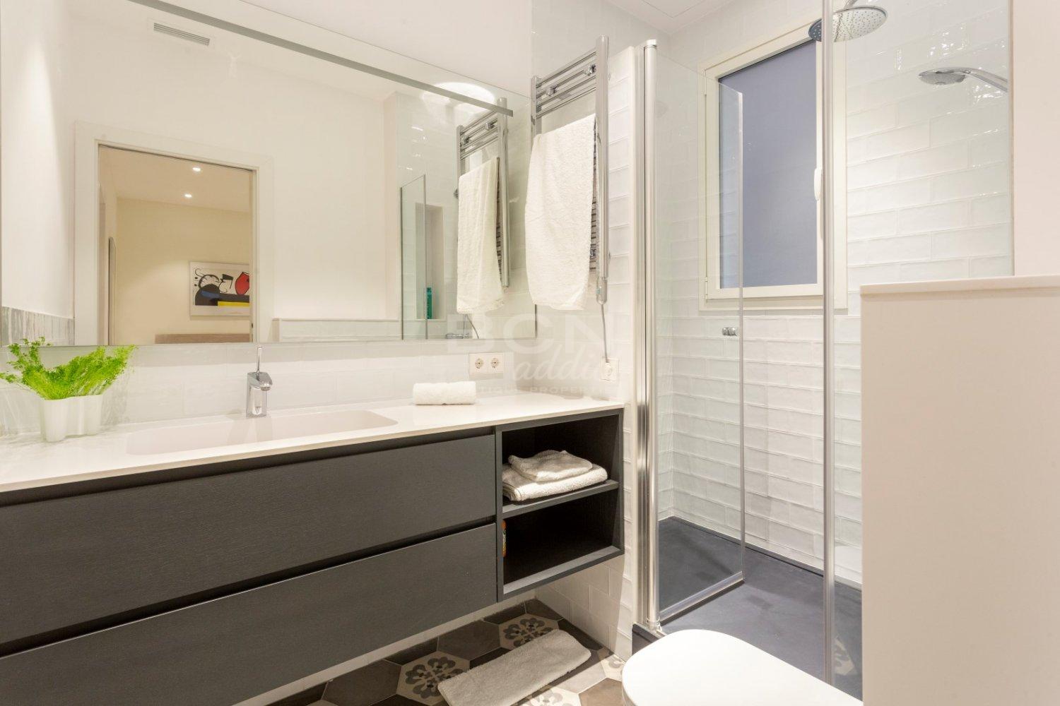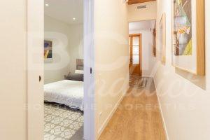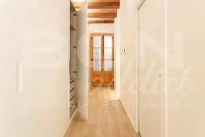 The house has been entirely renovated. The reform features a redistribution of the entire floor: a spacious open-plan kitchen connected with dining and living area offers direct access to the covered terrace. A vast reception zone and long hall provides access to all rooms. The property boasts two spacious bedrooms. One large master bedroom features en-suite bathroom, tailor-made wardrobe and lovely street side balcony. Another interior double room is accessible from the corridor and also offers en-suite bathroom and tailor-made wardrobe.
