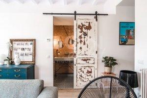 Next to the kitchen space there is a bathroom with shower which can be really practical for visitors. The stunning living room features high ceiling and massive brick walls.