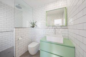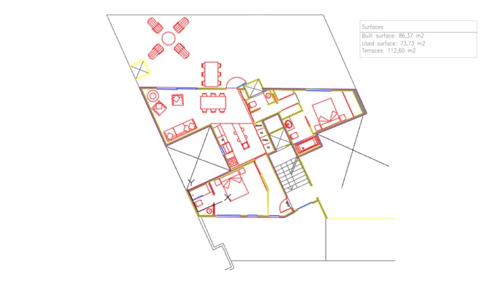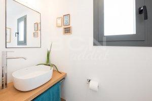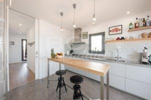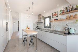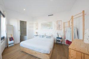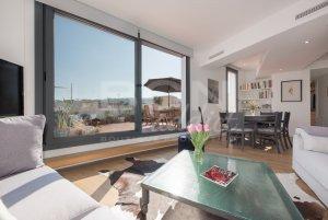 The kitchen, living and dining room combine into a single great room which boasts direct access to a spacious 86 m2 terrace on the same level, through an extra-wide window-door. The South East facing outdoor space seems to be a natural extension to the interior surface and offers panoramic views over the city and Montjuic’s greenery hill. The terrace features an outdoor kitchen island with sink and top. In addition, it disposes of utility spaces for washing machine and drier. This terrace continues further toward the main bedroom side. However, it is nicely separated by low partition wall providing extra privacy to the master suite.