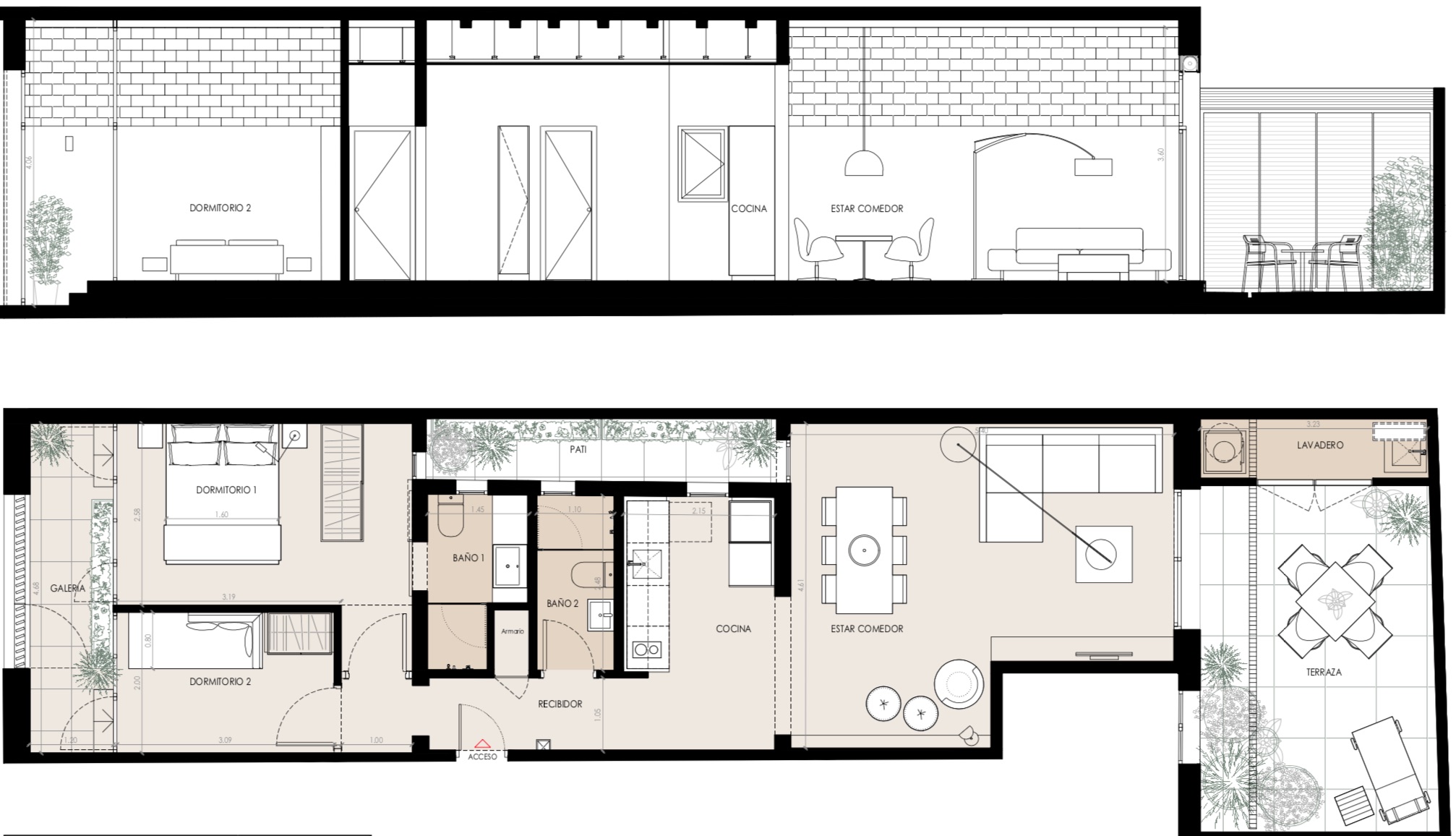 The space is decorated in minimalistic style with nice details. On the other hand the elaborately chosen opulent furniture make the apartment feel cozy. The gallery plants give it a tropical vibe as they are fully visible from both bedrooms.