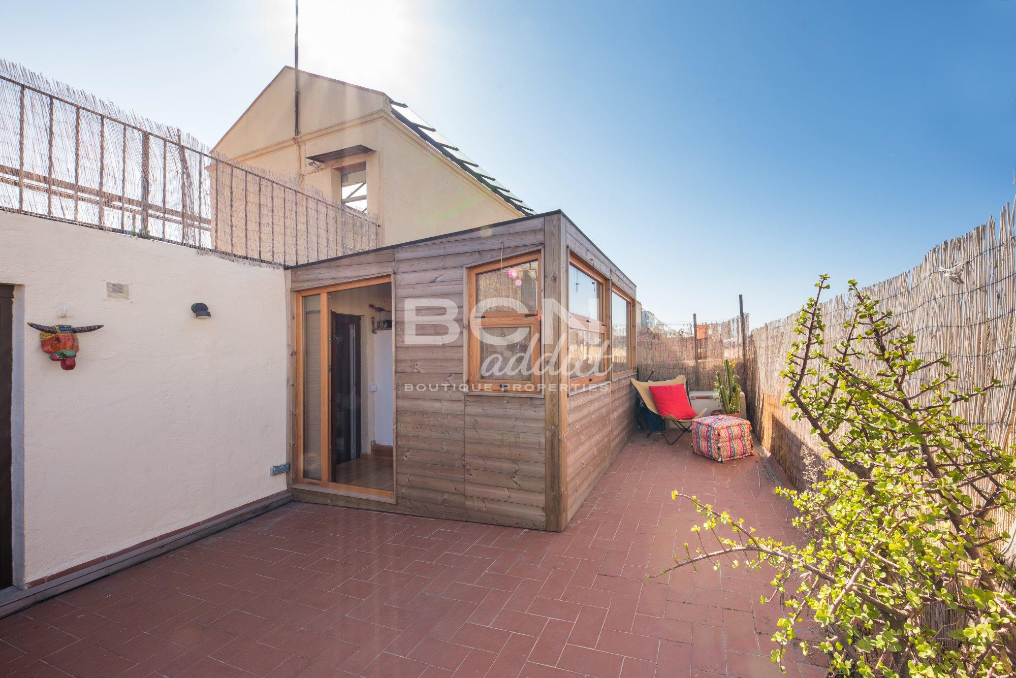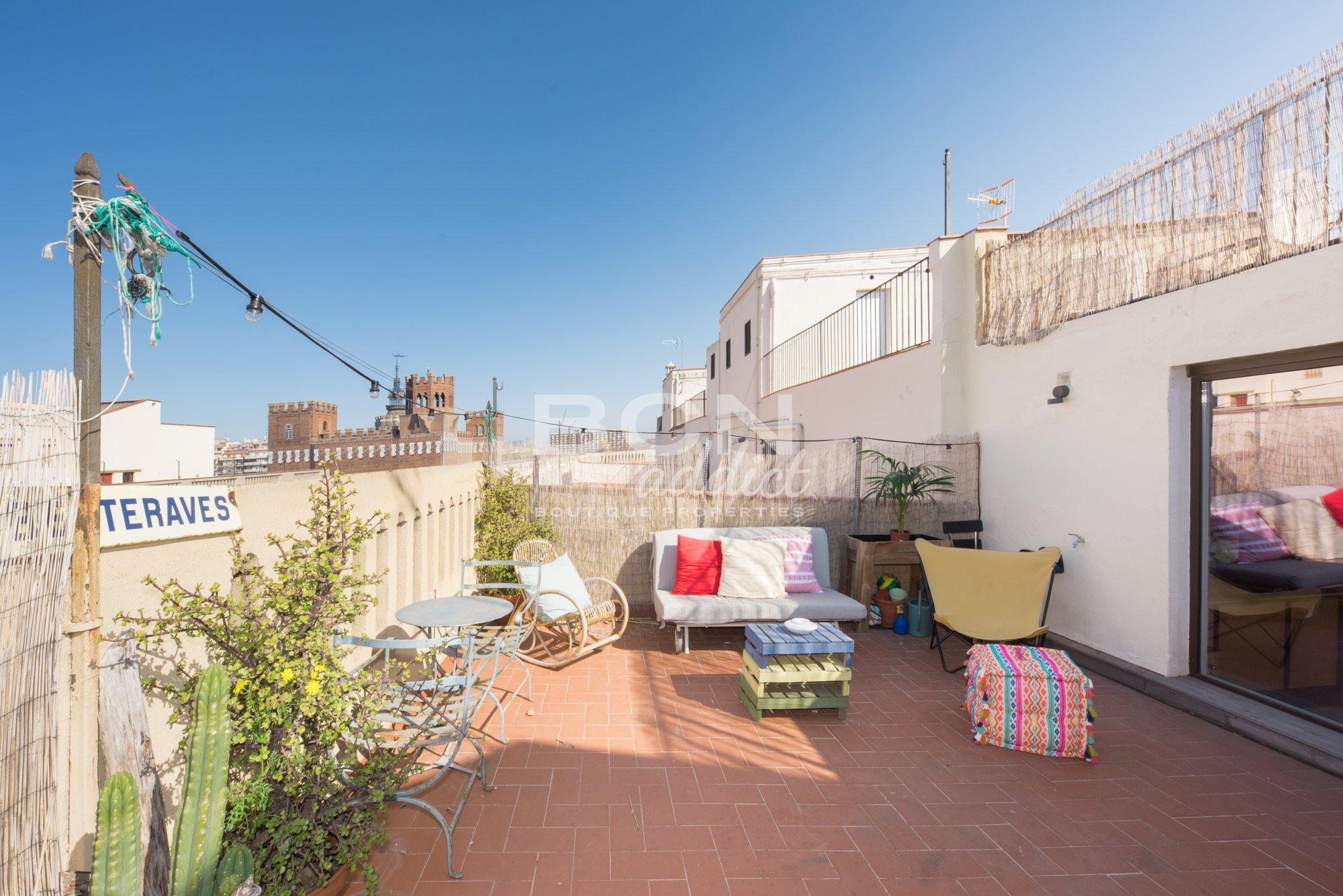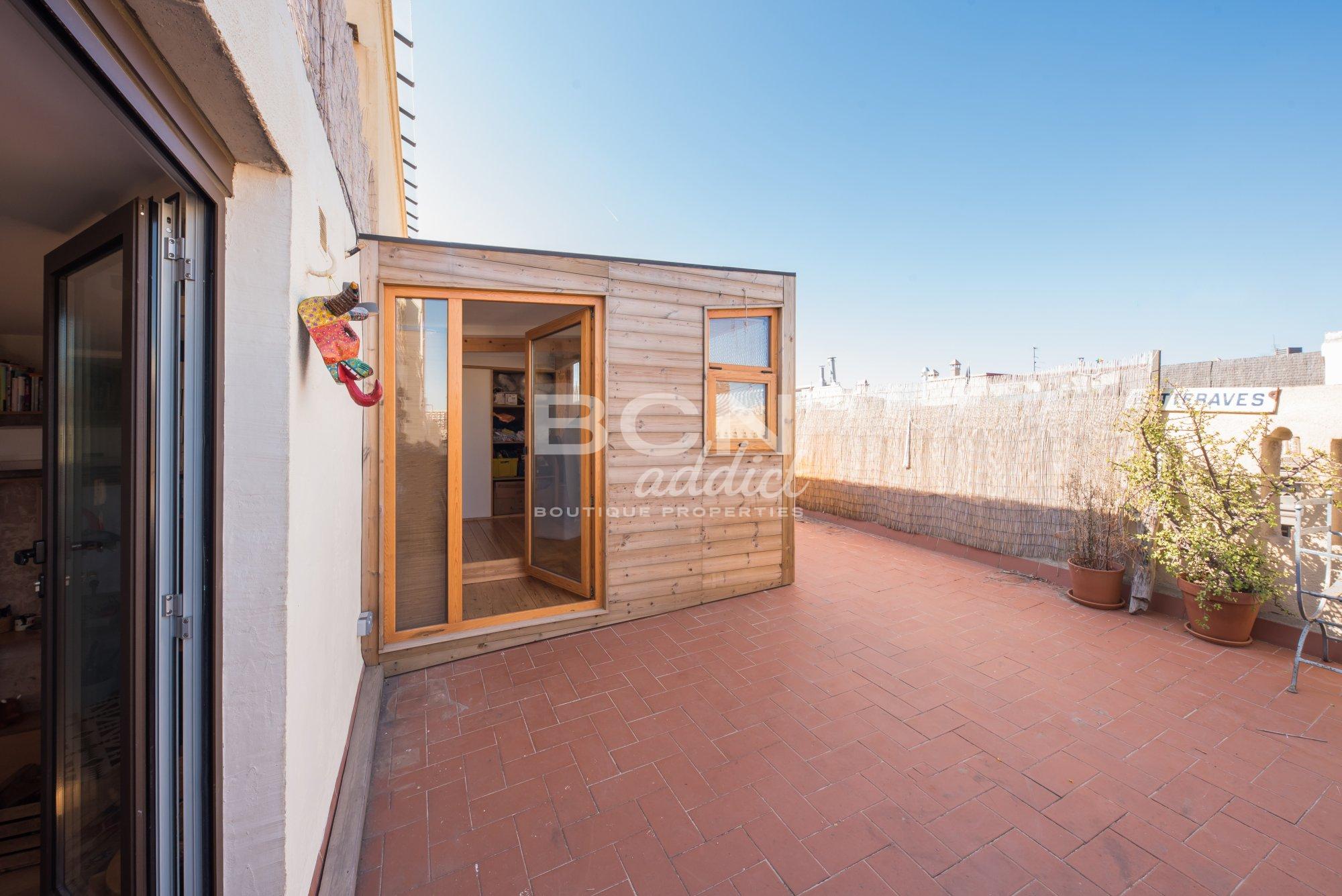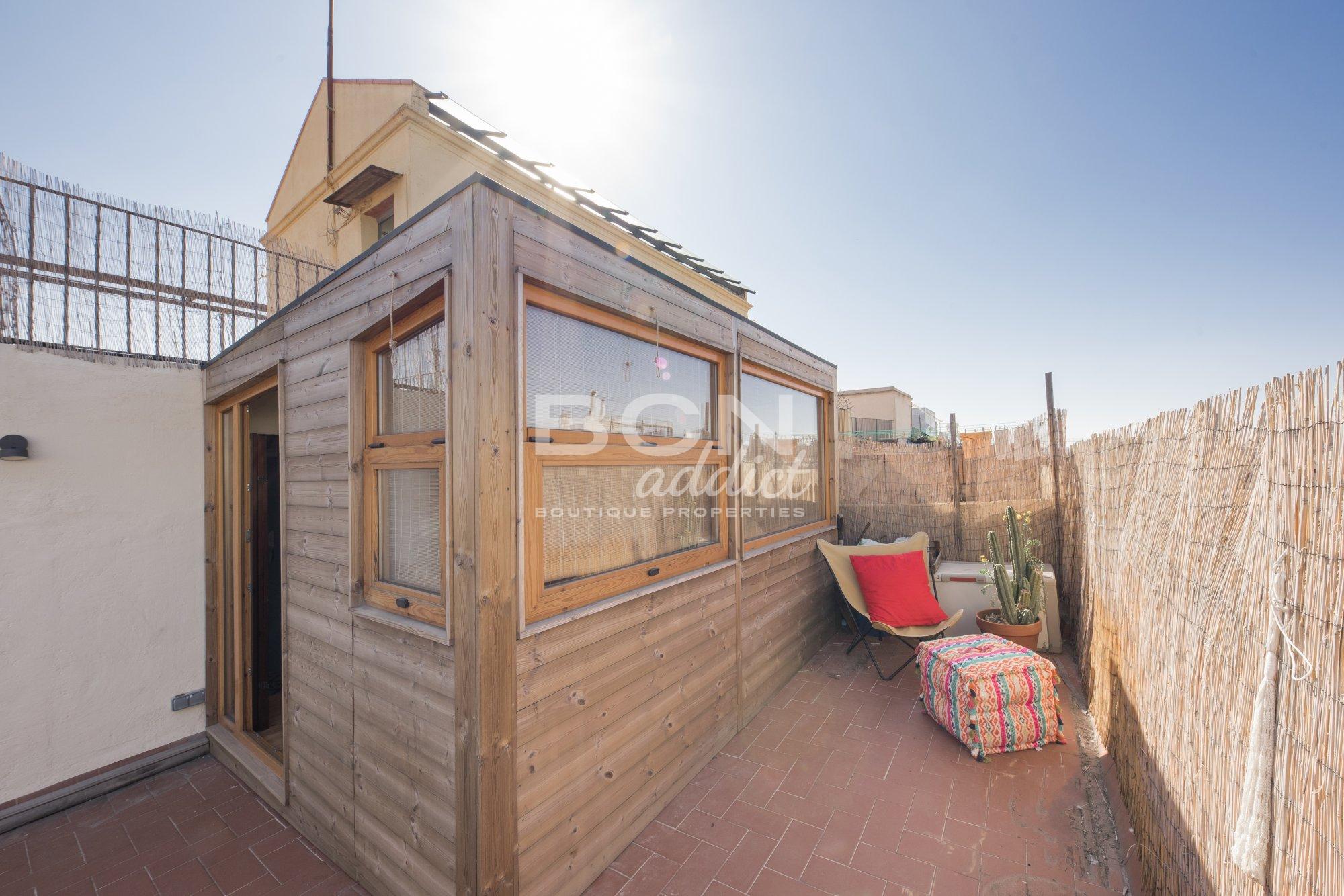 The property of 45 m2 interior built, is set on the fifth and last of a 5 storey-building. It presents bright living spaces with high ceiling and features exposed historical elements throughout. A superb 40 m2 terrace of private use on the same level boasts panoramic views over the city, Ciudadela´s castle and backdrop hills of Tibidabo. The outdoor surface features a wooden hut of 10 m2: it disposes of several windows, heating, water tab, downspouts and electricity access. This is an extra space for multi-functional usage.