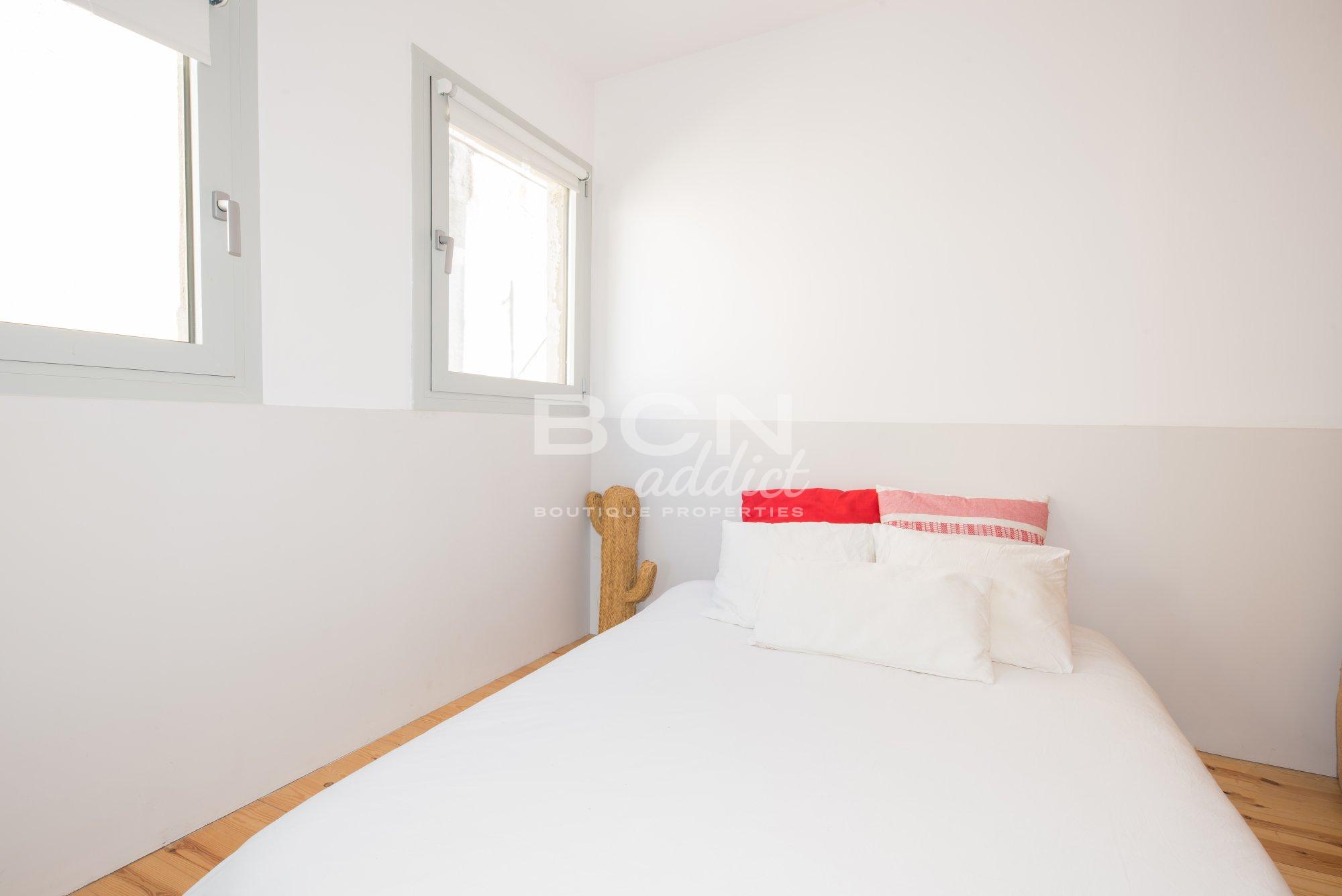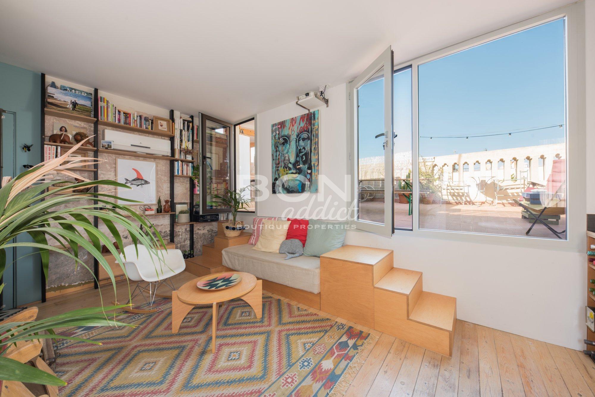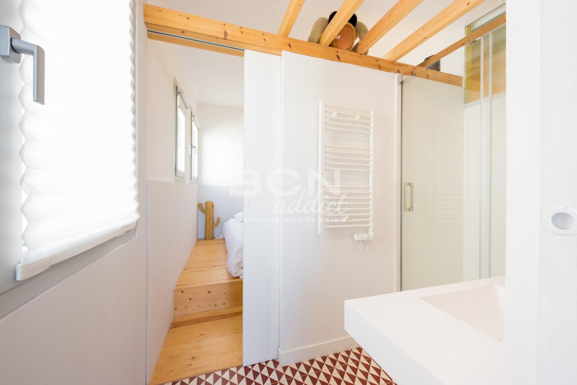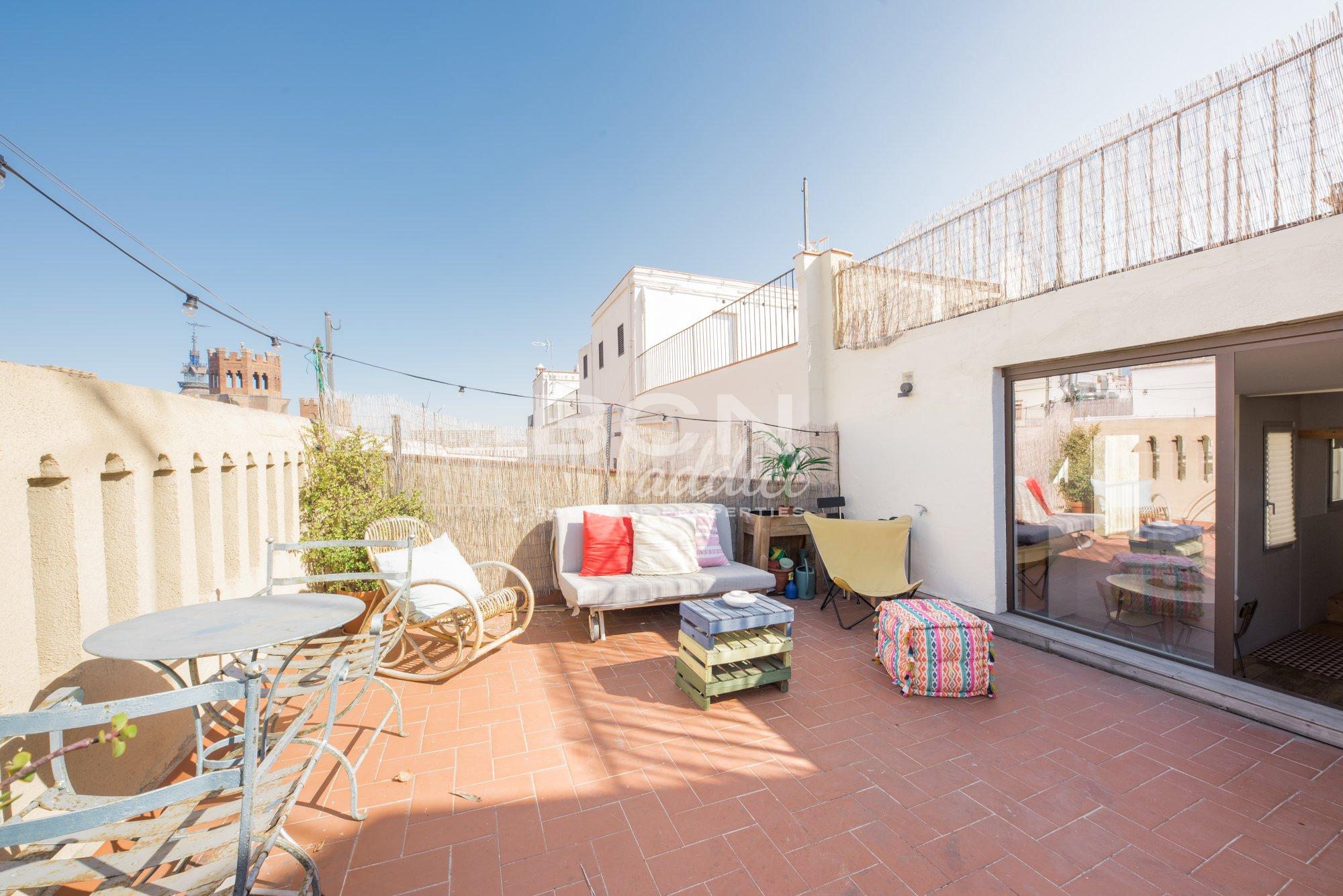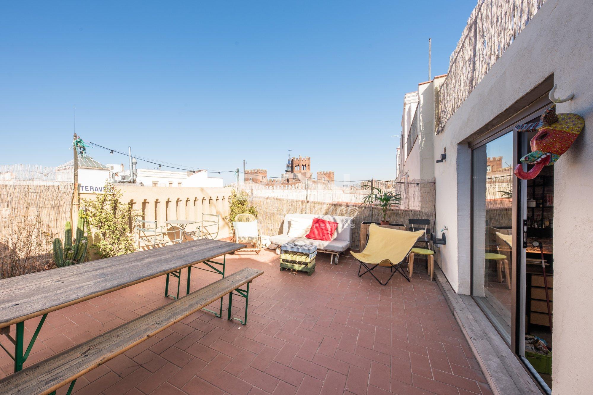 The property of 45 m2 interior built, is set on the fifth and last of a 5 storey-building. It presents bright living spaces with high ceiling and features exposed historical elements throughout. A superb 40 m2 terrace of private use on the same level boasts panoramic views over the city, Ciudadela´s castle and backdrop hills of Tibidabo. The outdoor surface features a wooden hut of 10 m2: it disposes of several windows, heating, water tab, downspouts and electricity access. This is an extra space for multi-functional usage.