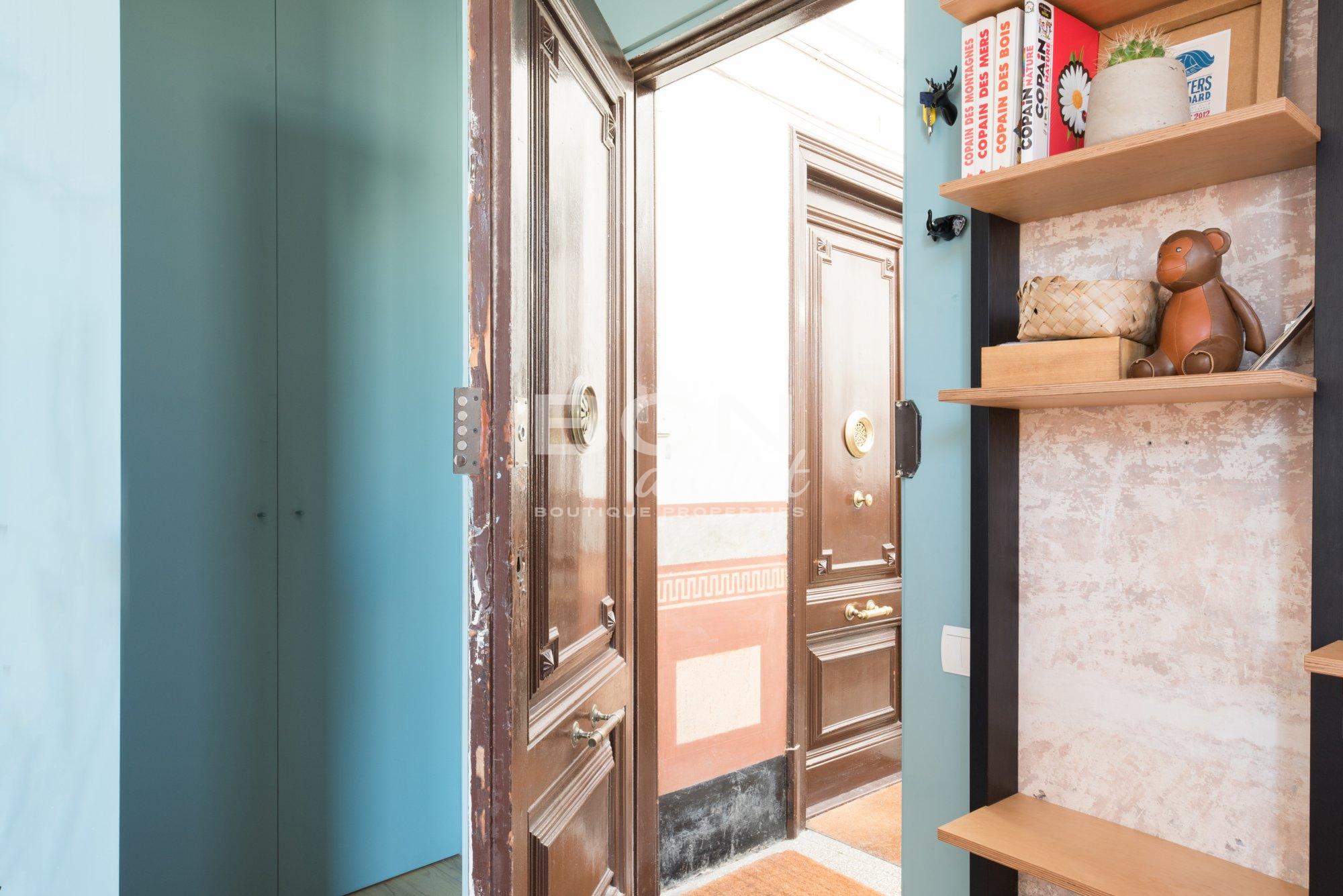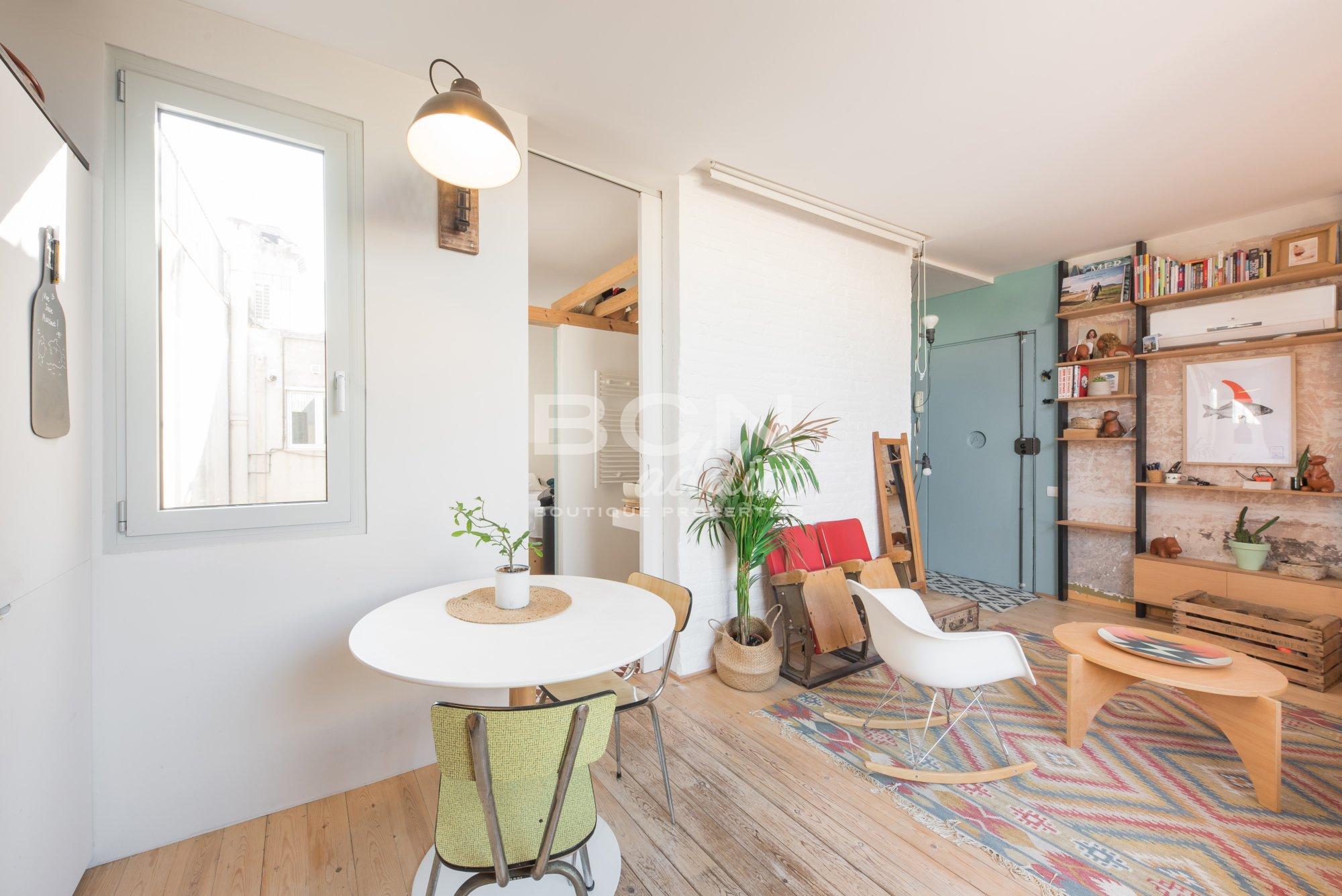 The penthouse is in excellent state as it was revamped 3 years ago. This charming last floor flat combines original elements such as exposed brick walls together with contemporary interiors design and materials. The bedroom, bathroom and kitchen benefit from natural light since they all have windows on the interior patio.