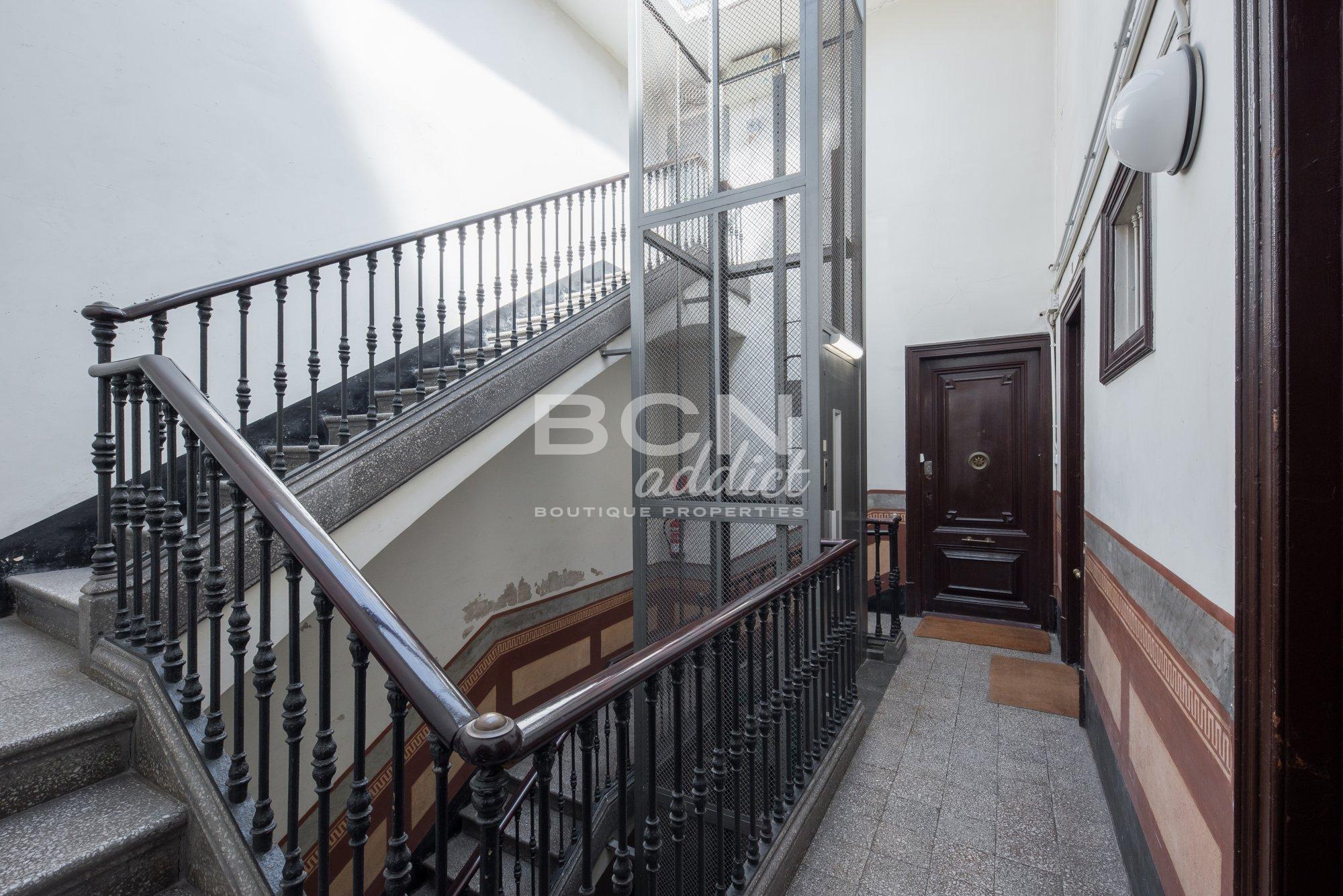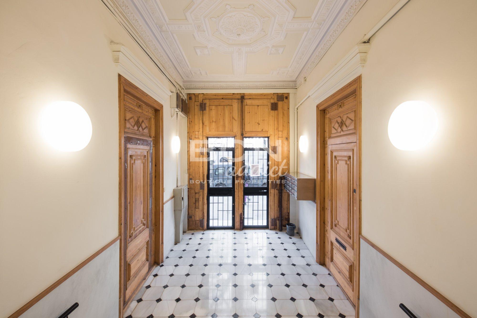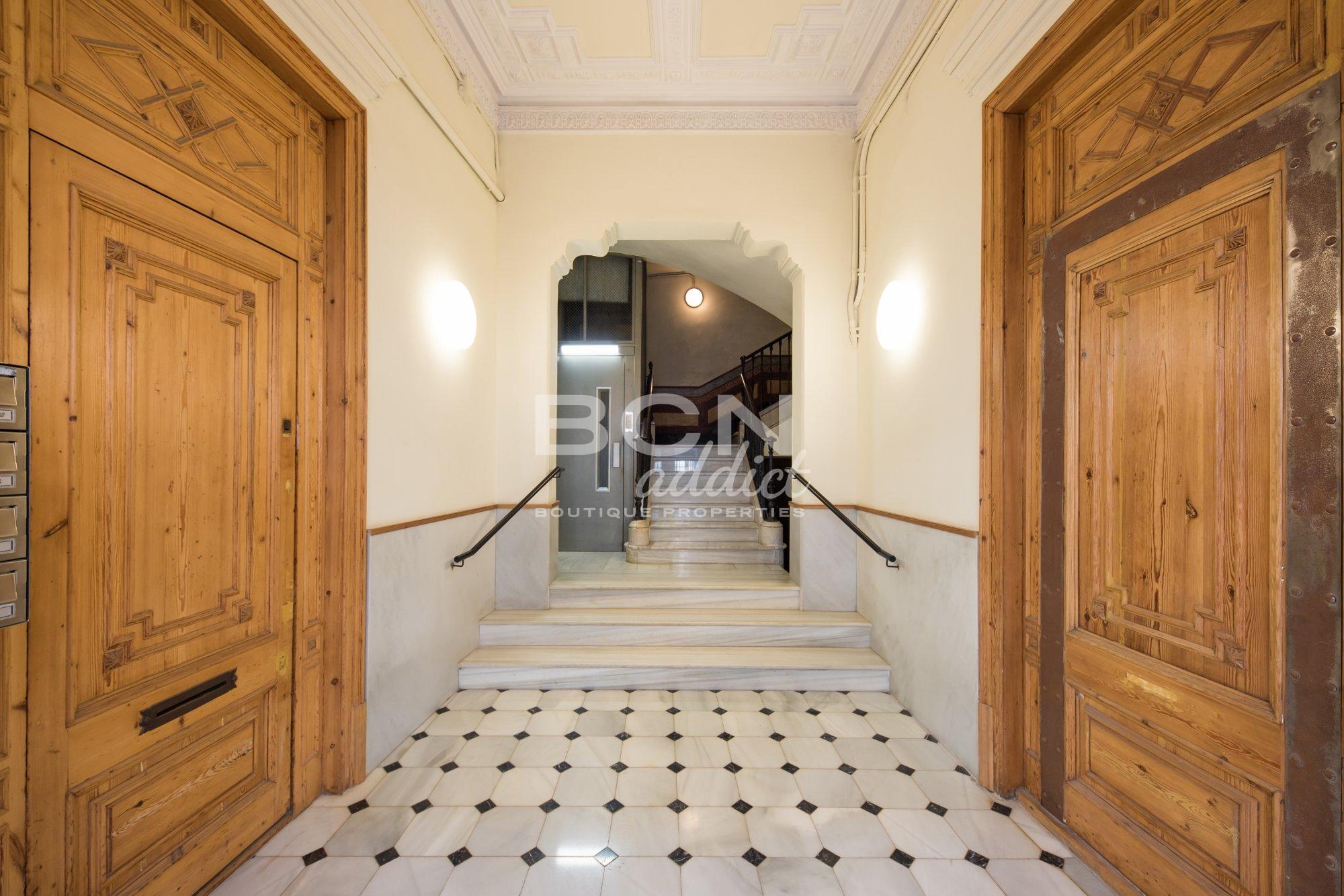 The flat is set in a beautiful noble building of 1900 with lift. The beautiful façade of the building offers well preserved moldings, round arched windows and windows-doors with iron balconies. The common areas also show great modernist drawings and molding in the entrance and staircase.
