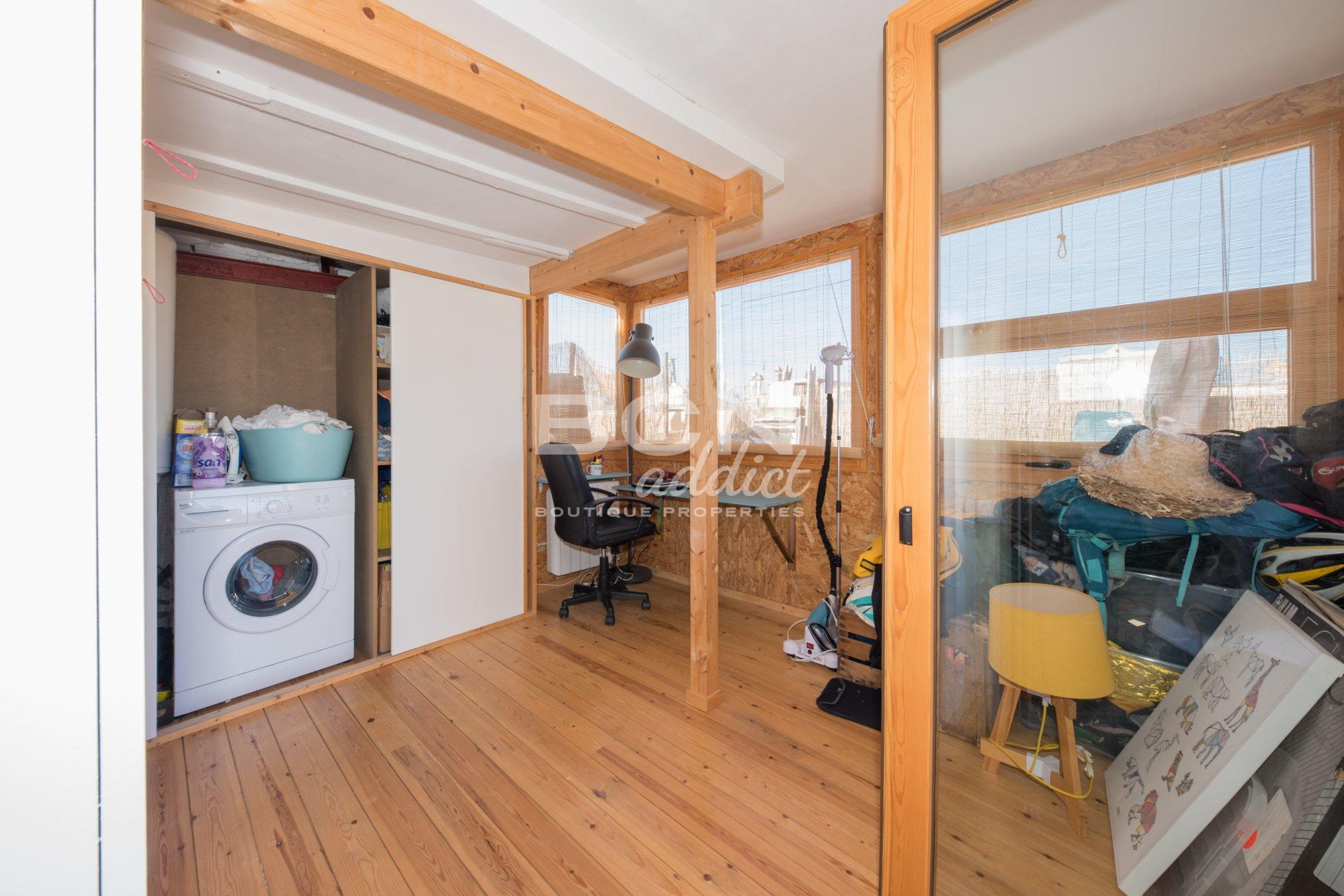 In the entrance, the property offers a built-in cupboard and disposes of a separate toilet. A generous open-plan kitchen living-dining room provides access to the terrace via an extra-large window-door and to the wooden hut through another window-door. The contemporary kitchen offers sleek modern built-in furniture with all necessary appliances (fridge, freezer, dishwasher, oven, hob, extractor). The contemporary bathroom features large shower. The double bedroom offers a built-in wardrobe.