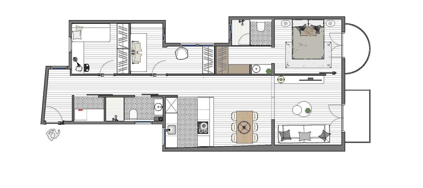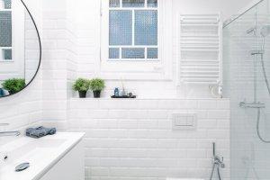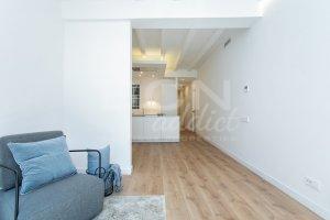 Entirely rehabilitated, the apartment has an elongated shape. The foyer leads to a large open-plan space which comfortably connects living and dining area with kitchen, forming a surface of almost 30 m2. It gives access to the main suite – a bedroom with bathroom and dressing room. Both living area and suite are opening up to the balcony. Two more bedrooms, both individual, and a complete bathroom, are accessible from the foyer. Fabulous combination of bright colors, minimalist design, wooden parquet and large windows, that let the natural light flood in, give the apartment really modern vibe without depriving it of coziness.
