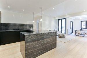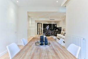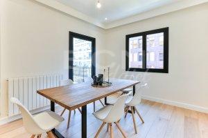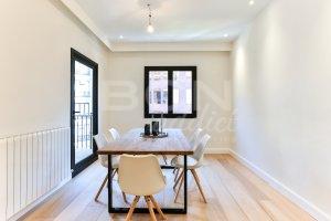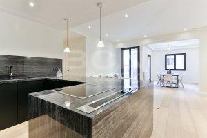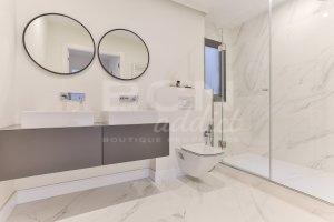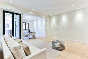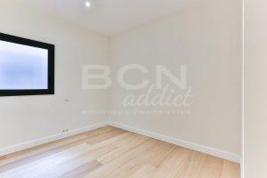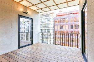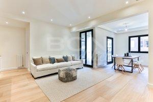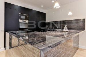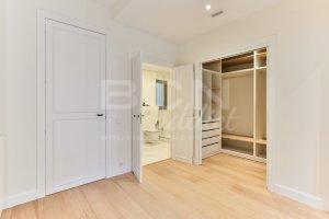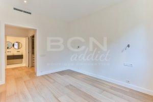 In front of the entrance area, divided with a full-glass door, you find the heart of this property: the living and dining space, with an open-plan kitchen, all in Matimex, altogether occupying 50 m2. Large windows and two French doors provide the apartment with a great amount of natural light, since it is enclosed around a vast terrace that opens up to the Muntaner street. Going through a small pantry space, we reach another night zone – a large, spacious suite. The first area that belongs to it is a multifunctional space that can be adapted according to your plans – for example as an office or a library. The double door on the left leads to a large bathroom, fully equipped and decorated with high-quality materials and details. This suite of 26 m2 also has a walk-in closet. Entirely divided from the rest of the property, the spacious suite gives a sense of intimacy, while the French doors leading to the terrace provide it with natural light in the morning.