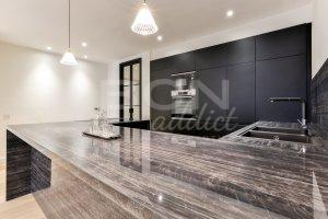 The apartment’s interior is not divided in a common way – the designer put the emphasize on the spatial fluidity. Bathed in bright colours and light, the spaces are accented with black furniture and other elements. This contrasting look is completed by use of materials such as marble and wood, giving the apartment a cosy sensation, but without diminishing its elegance and opulence.