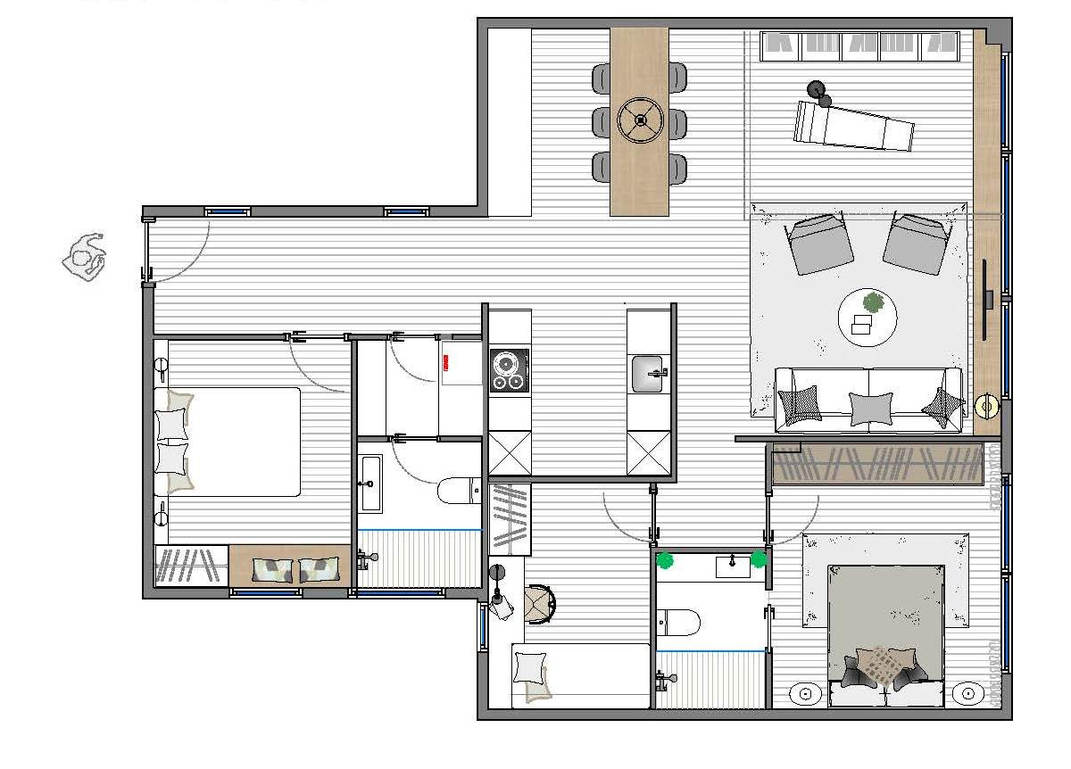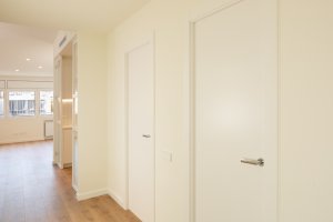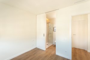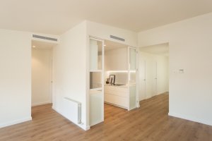 Situated on the 6thfloor, this apartment is incredibly sunny and bright in all its rooms. Opening up to the Tarragona street and being totally exterior, it receives sun all day long and boasts city centre views. Meticulously renovated in modern style, this property is spacious and bright, the effect that is multiplicated thanks to the use of light colours in the interiors. The 96 m2 of surface are distributed in a practical way. The vast foyer leads us to the apartment’s heart: the living and dining area of 25 m2. Its large windows occupy all the exterior façade, which guarantees sunlight flooding in. Independent from this area, there is a kitchen oriented to the dining room. Fully equipped, it is provided with machines of high-end brands, such as Bosch, Grohe or Siemens. Just behind this space there are bedrooms hidden: the main suite with bathroom and one single bedroom, while the other double bedroom and the second bathroom with water area are accessible from the foyer. Meticulously chosen details, such as porcelain tiles used on the floor, integrated LED illumination or fitted wardrobes, but also fabulous use of glass, testify to the uniqueness of this property.
