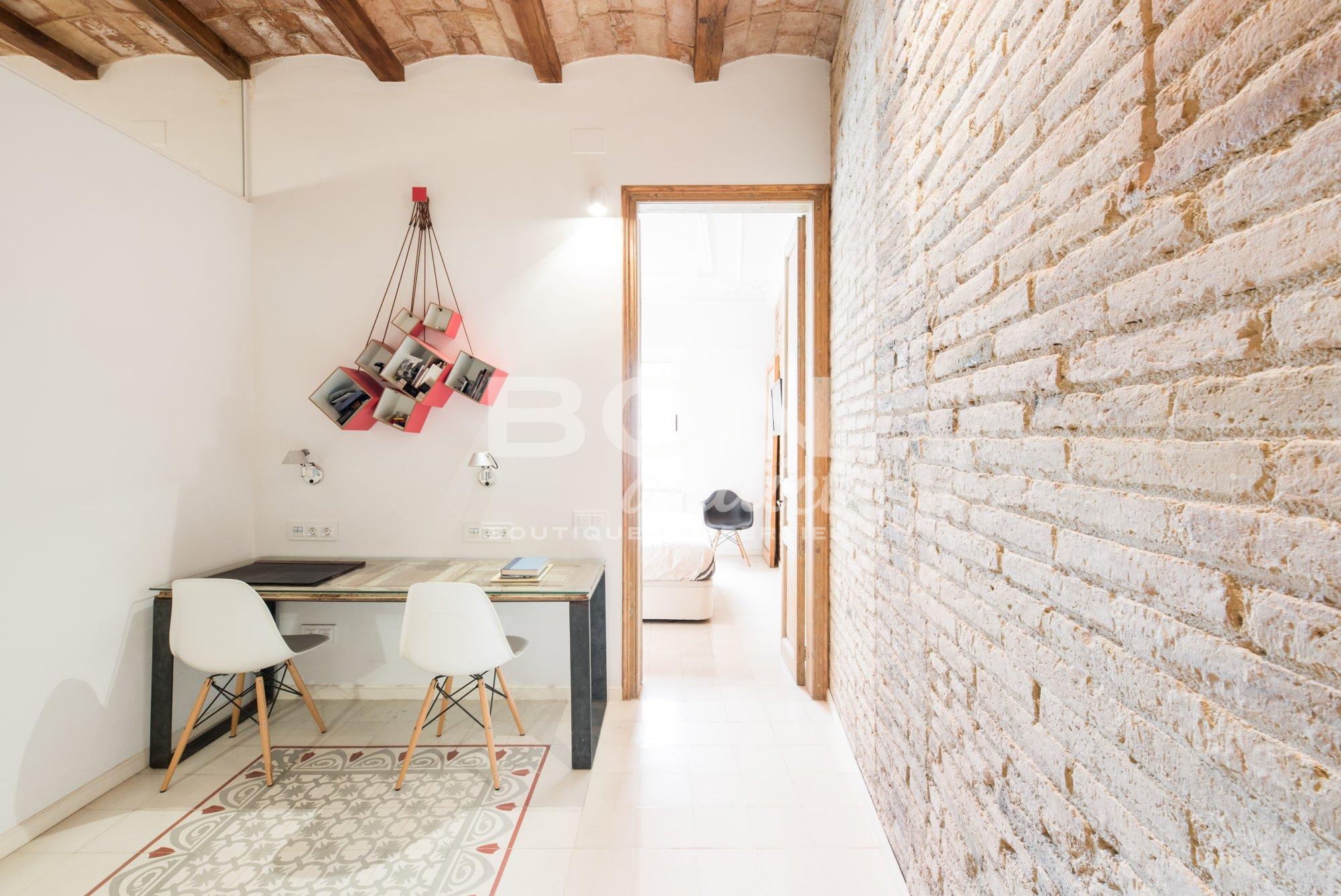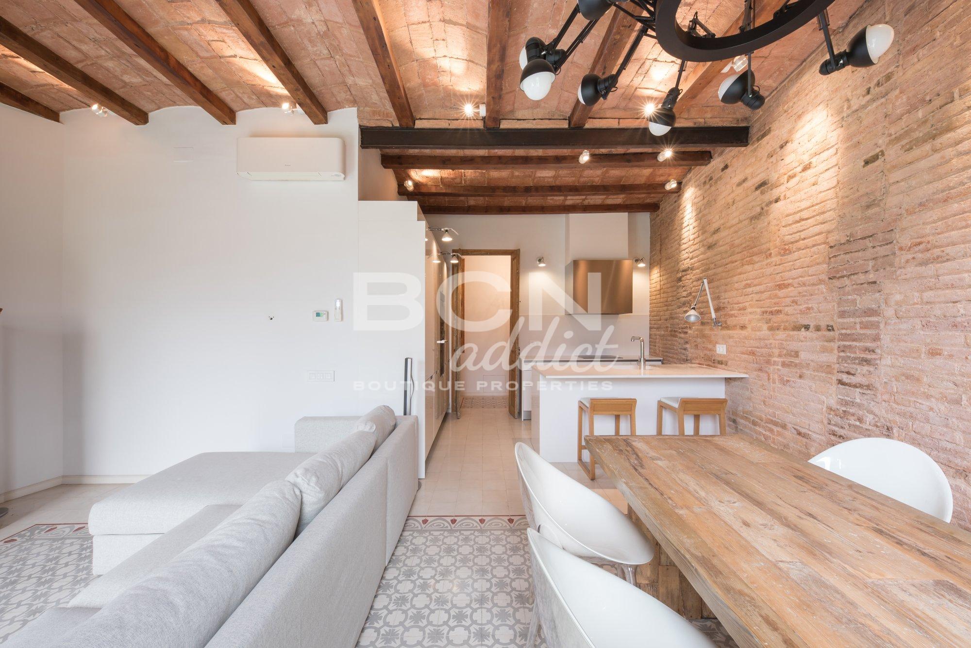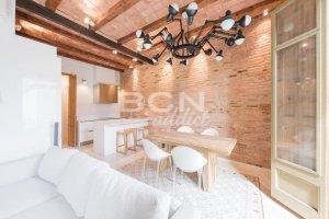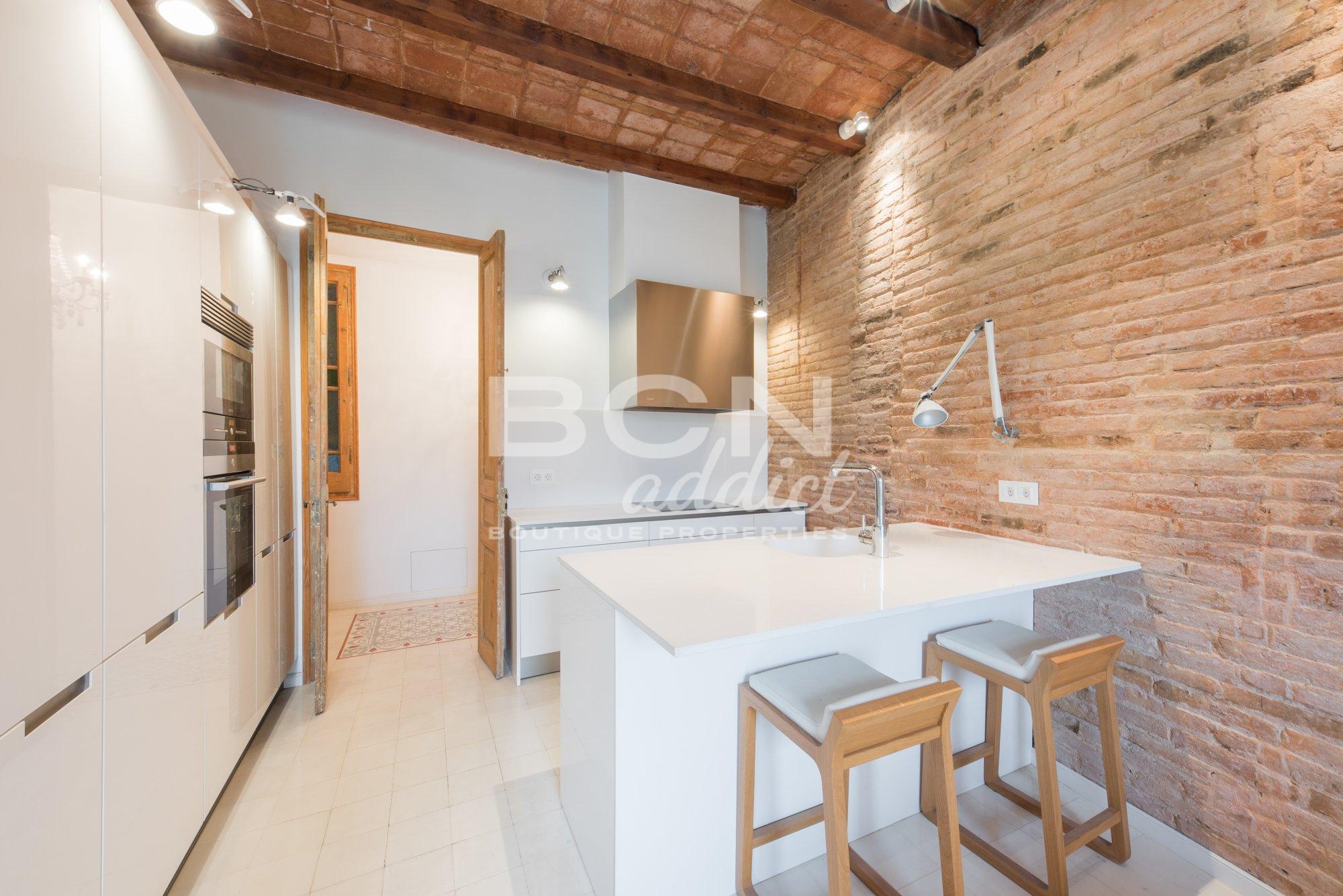 The property of 92 m2 has being totally refurbished in 2014 and combines historical elements (genuine hydraulic floor, original carpentry, exposed brick walls and Catalan vaulted brick ceilings) together with modern interiors and premium materials using well-known brands. The apartment is equipped with several down-light inset or visible lighting systems, air conditioning with 2 splits of dual functions cooling and heating, gas boiler for hot water and radiators, double glazed windows or tailor-made kitchen furniture and central island with fitted appliances.
