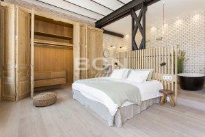 The open plan unit has a fully-fitted modern kitchen with a counter on the interior wall side, boasting vast dining and living areas with spectacular views outside. The many windows doors contrast with the ocher color of the exposed brick walls. The tick wooden parquet combined with the iron beams of the ceiling also enhances the aesthetic appeal of this luxurious apartment.