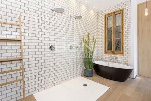 The whole unit features impeccable interiors with premium materials of well-known brands. The apartment is equipped with air conditioning (cooling and heating splits), boiler for hot water, double glazing windows, kitchen cabinets and appliances (cooking spot, oven, fridge, freezer storage, dishwasher, washer included) and bathroom elements.