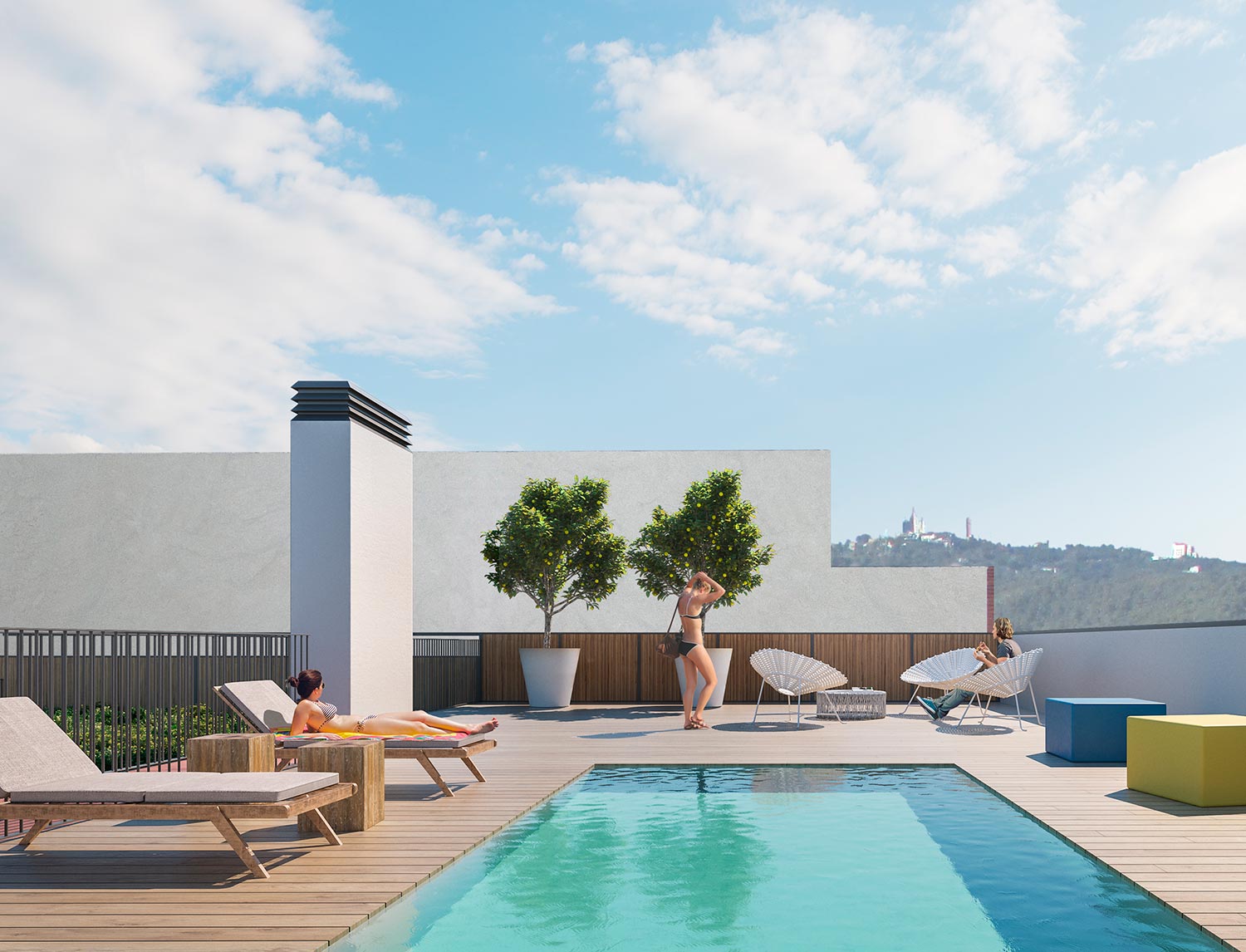 The low-rise building of 2 floors was recently terminated: it boasts a stylish façade with a combination of tiled walls and glass openings. The building has a community roof top with with pool and offers spectacular views over the city and further to the sea and Tibidabo mountain backdrop.