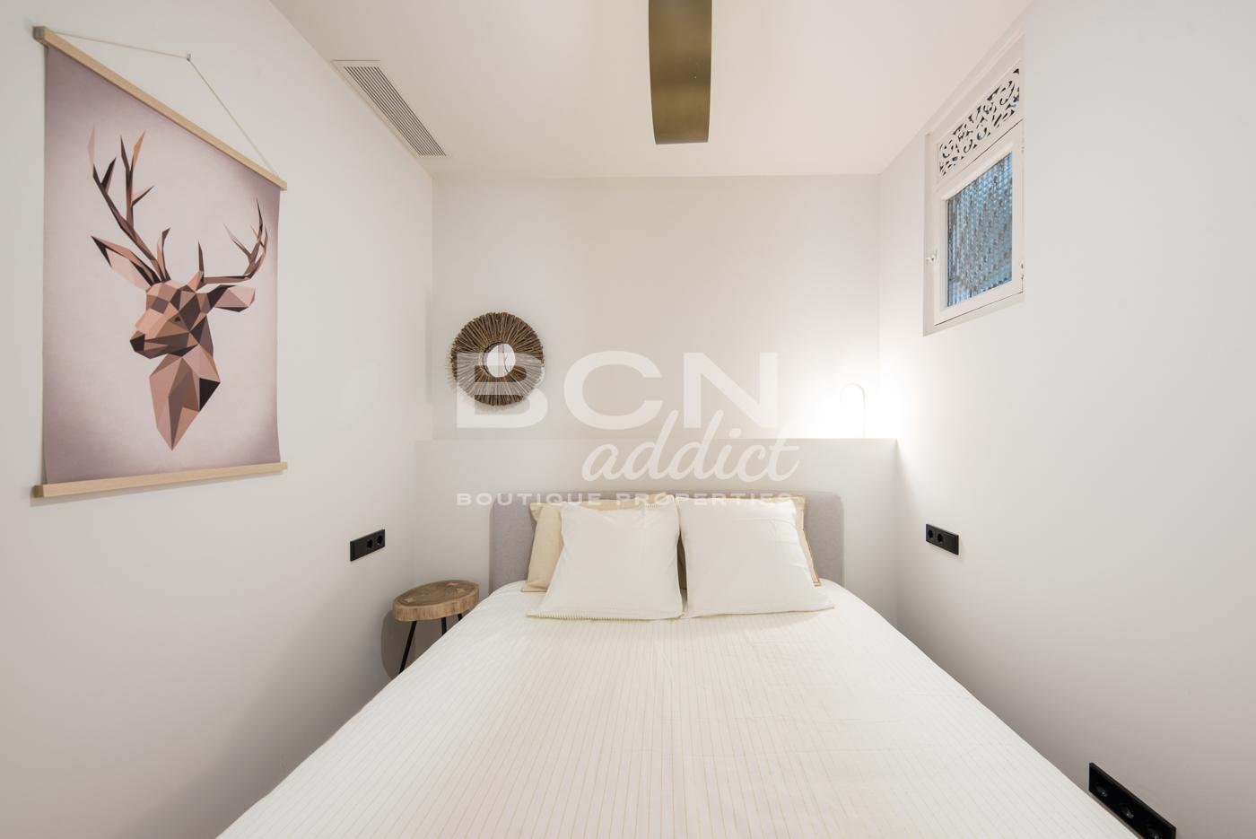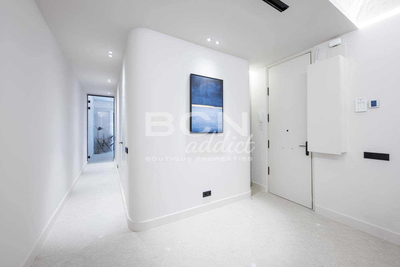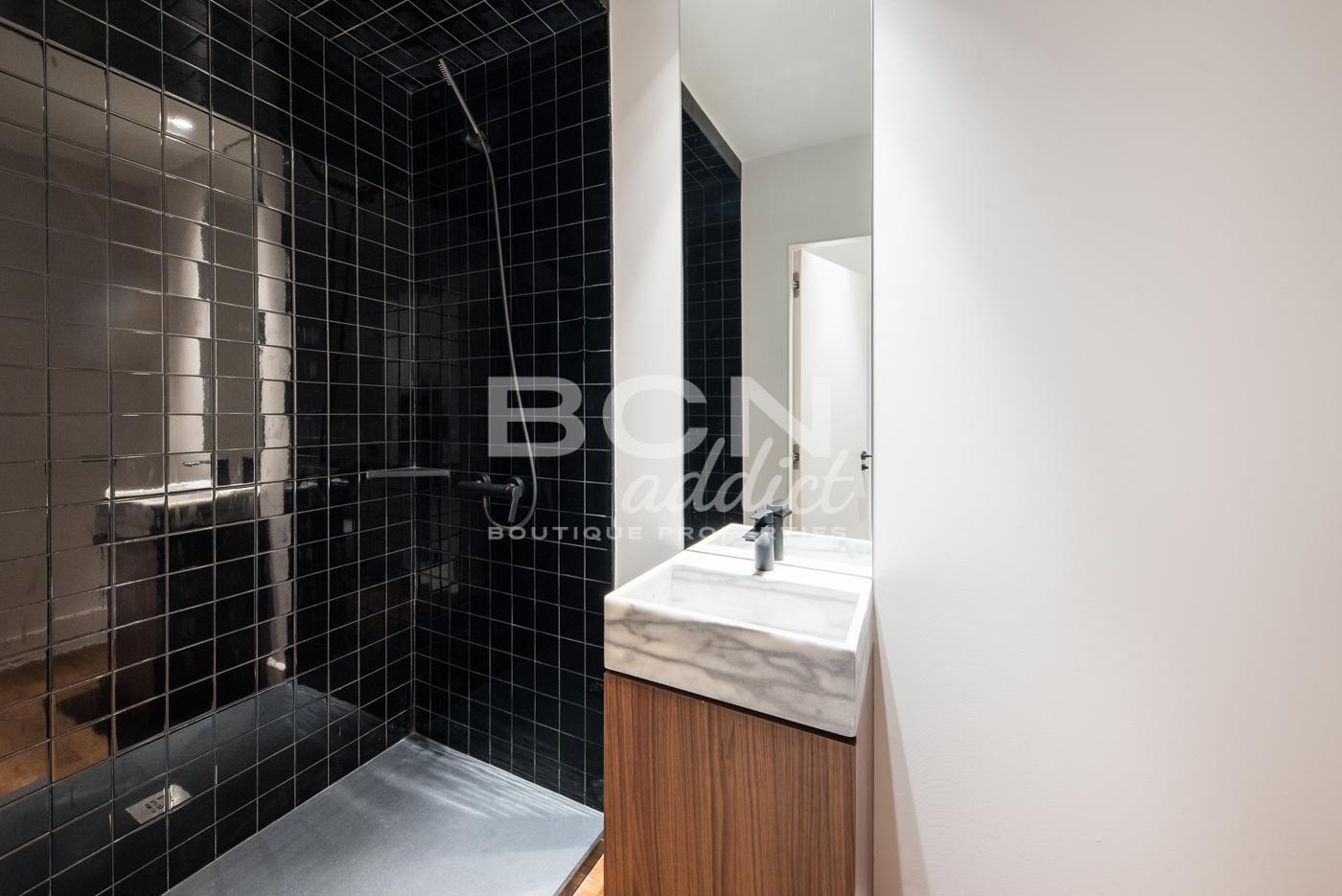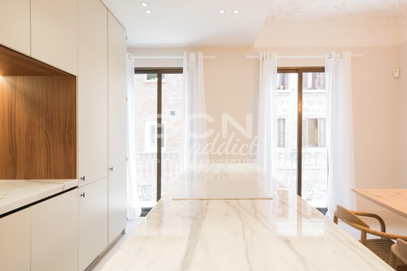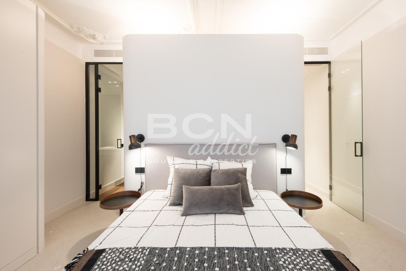 El piso de 98 m2 está dentro de un edificio con una fachada impresionante. Algunas partes comunitarias han sido rehabilitadas hace poco. Al entrar en la vivienda encontramos la zona de día de 50 m2, compuesta por un salón conectado a una cocina abierta-comedor que dan salida a un balcón. A destacar la combinación de estilos, en el techo se han restaurado las molduras. La reforma recién ejecutada, con materiales nuevos, ha dado el protagonismo a los techos originales. La cocina equipada con electrodomésticos de gama alta integrados, está diseñada a medida con líneas limpias que se mimetizan con el ambiente agradable del piso. La zona de noche se compone de dos dormitorios con armarios empotrados y dos baños. A la habitación principal de 21m2, con salida a dos balcones exteriores, tiene un amplio baño con cuidados detalles de diseño. El piso dispone de aire acondicionado con sistema Airzone con bomba de frío y calor y persianas automáticas. Entre otros detalles encontramos muchos elementos a medida como las puertas de vidrio templado con marco metálico, picas en baños y mobiliario de cocina