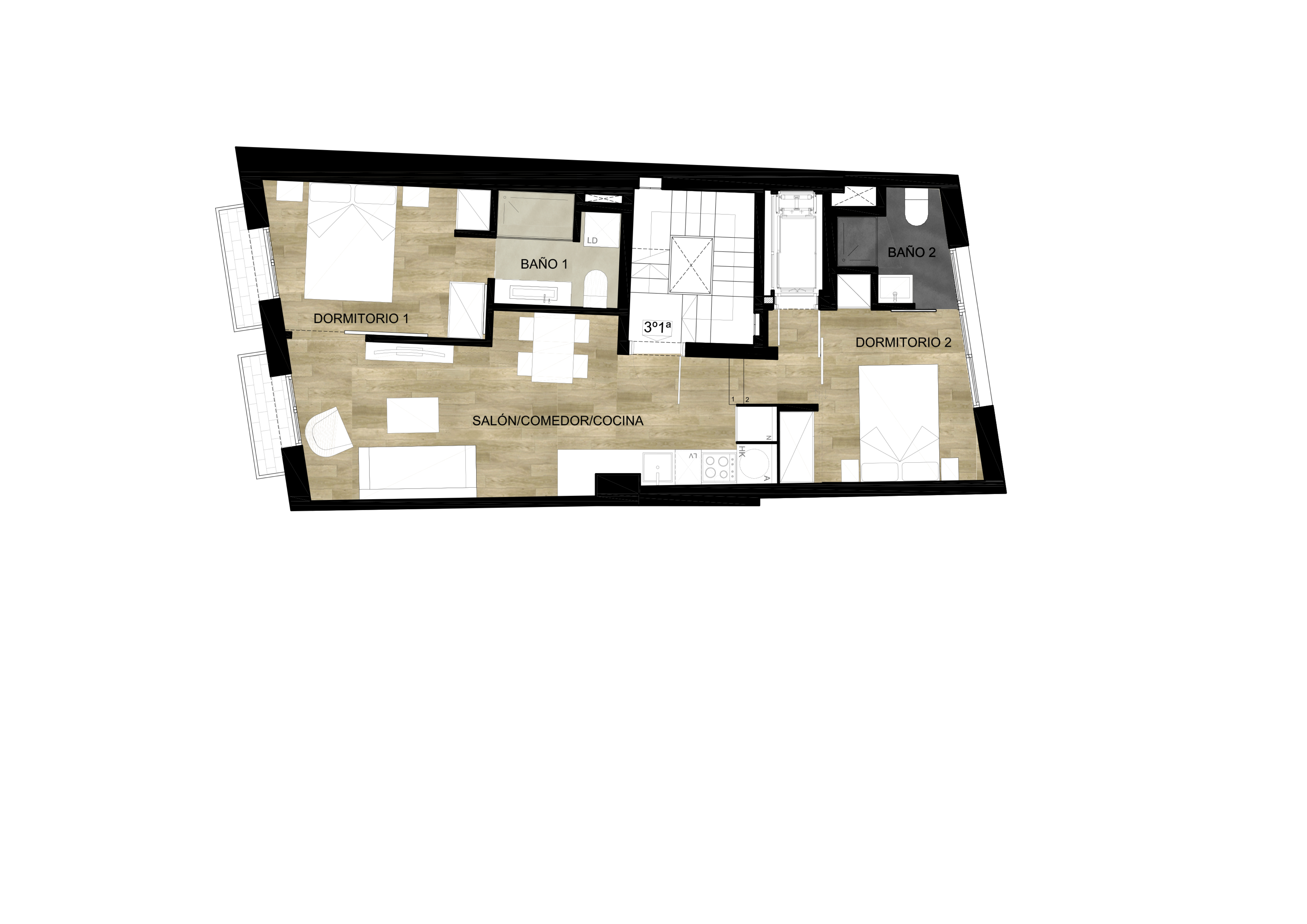 Modern and sunny apartment with 2 bedrooms and 2 bathrooms en suite, with an area of 61.2m2. Direct elevator to the apartment.