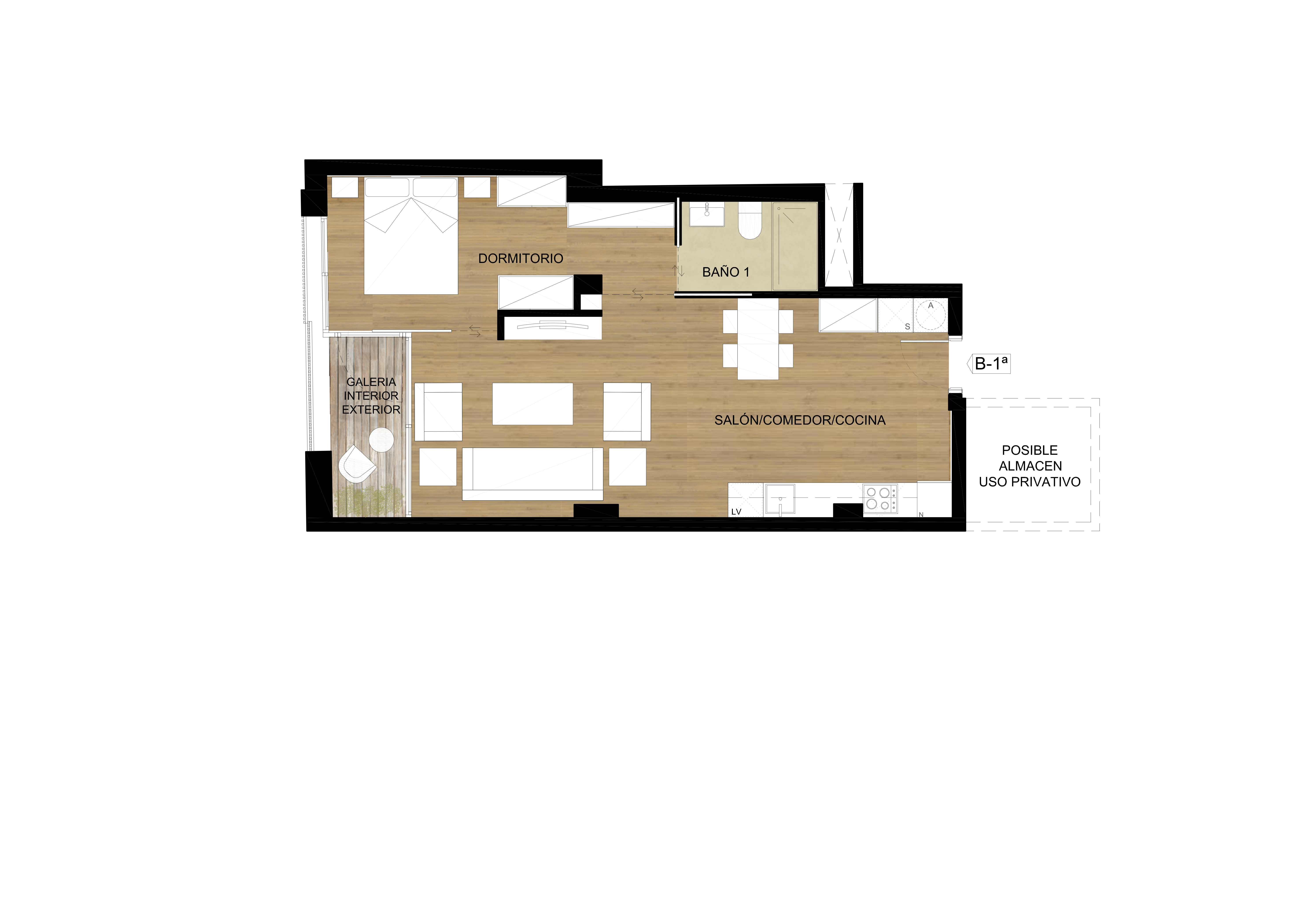It is made up of spacious and bright apartments of 85m2 and 110m2 with exterior balcony-terrace or interior gallery, in total 10 flats with Cedulas. The flats have two bedrooms with two bathrooms and another space as a third room when needed.