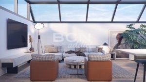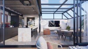 With the lift you arrive to the top floor with its custom-made kitchen open to the living room. The living room is made of an all glass structure which allows a lot of natural light to come in and gives you the sensation you are living outdoors from your salon, it is connected to a large terrace on the same level.